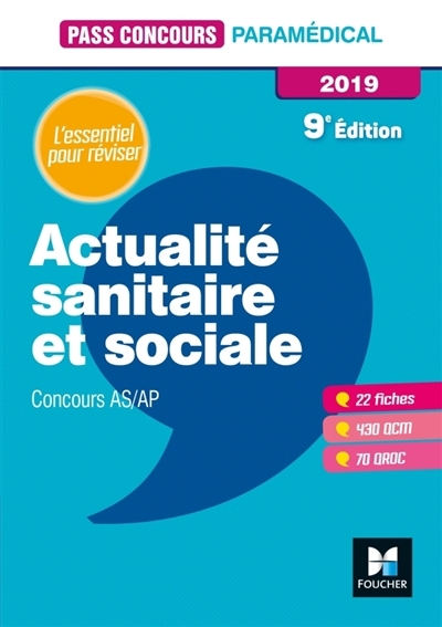 Actualité sanitaire et sociale Concours AS/AP 2019 Des fiches synthétiques pour réviser . Les thèmes sanitaires et sociaux incontournables en 22 fiches Des exercices pour s'entraîner . Un entraînement efficace et varié en 430 QCM et 70 QROC Des corrigés pour s'améliorer . Toutes les réponses justifiées et détaillées
