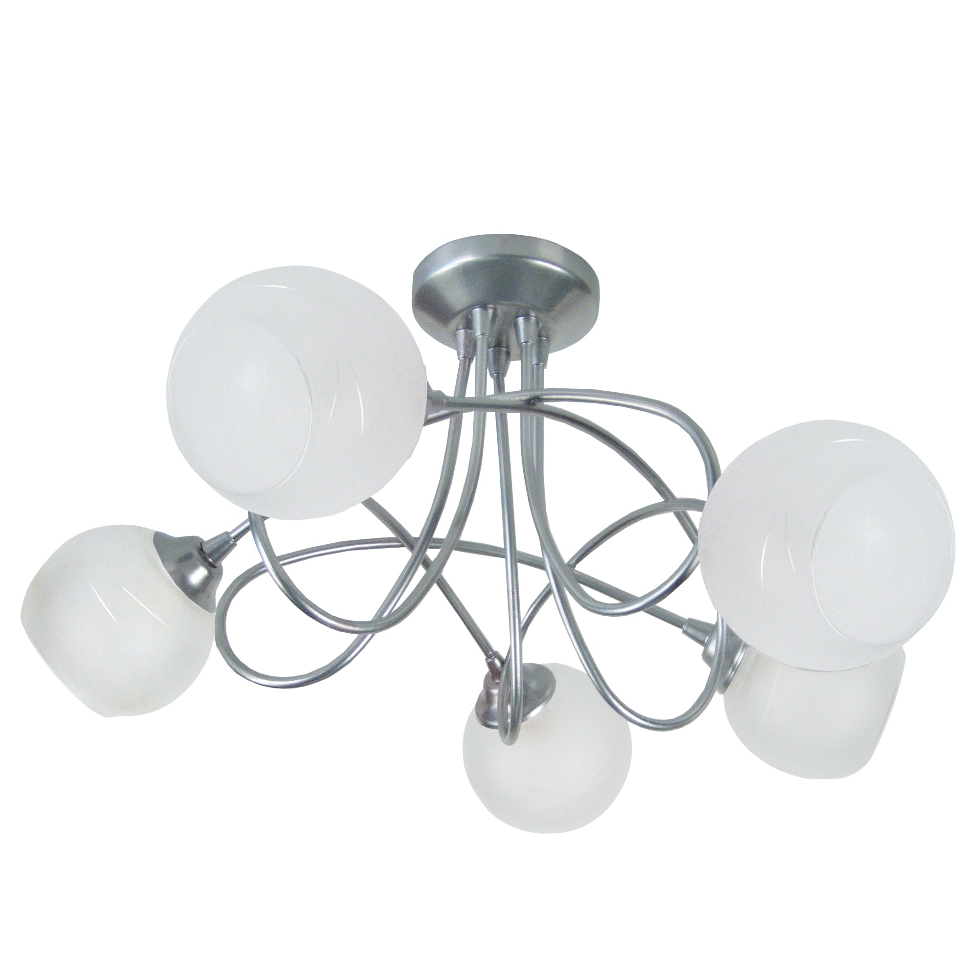 Un plafonnier moderne et contemporain, équipé de 5 bras tube métal et de trois globes en verre, décorés en mat, qui permettent une lumière douce et uniformément répartie, donnant à votre chambre, salon, salle à manger ou même votre bureau une touche de modernité, de confort et surtout toute la lumière dont vous avez besoin. Un produit fabriqué au Portugal, totalement éco-durable, utilisant des matériaux 100% recyclables, fer et verre. - Lustre ACTUELLE A multi bras métal aluminium - Abat-jour verre couleur satiné forme globe - Douille G9 x5 lumière - Ampoule non inclus conseillé: LED 7W (halogène, maxi. 40W) type standard A19 - Projection lumineuse ambiant - Connexion réseau électrique: boîtier de connexion isodom - Interrupteur non inclus - Style urbain - Classe de Protection I - Indice de protection: IP20 - Dimmable , dimmer non inclus - Tension de fonctionnement : 230V - Tension d'alimentation : 230V - Dimension abat-jour: Hauteur 9cm x Longueur 11cm x Largeur 11cm - Dimension global: Hauteur 33cm x Longueur 50cm x Largeur 50cm - Poids net du produit: 1,4Kg