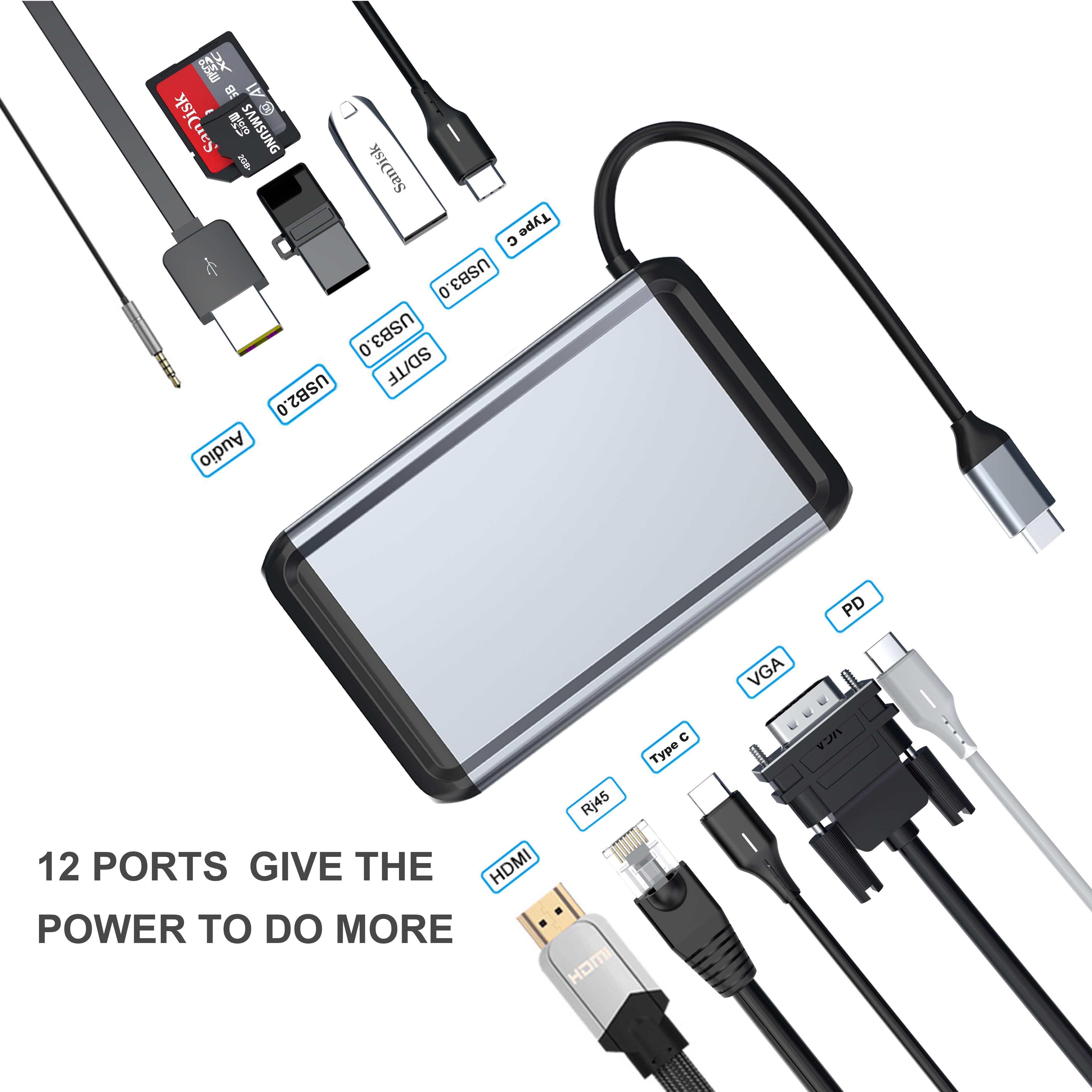 Adaptateur de concentrateur USB-C 12 en 1 avec HDMI, VGA, Ethernet et plus