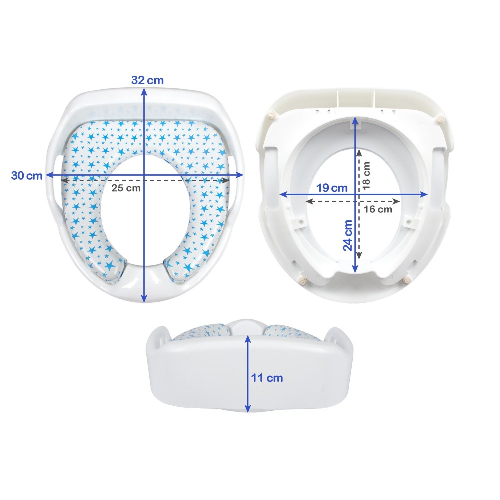 • Doux et confortable • Fond antidérapant • Soutien arrière • Les détenteurs mettent en sécurité • Hygiénique avec son siège amovible essuyable • Convient à toutes les tailles de toilettes.Dimensions: 30x32x11 cm • Ne contient pas de colorants azoïques, d’éléments toxiques. ATTENTION : Ce produit ne convient qu’aux enfants qui peuvent s’asseoir sans aide. Ne laissez jamais le bébé seul et sans surveillance lors de l’utilisation du produit