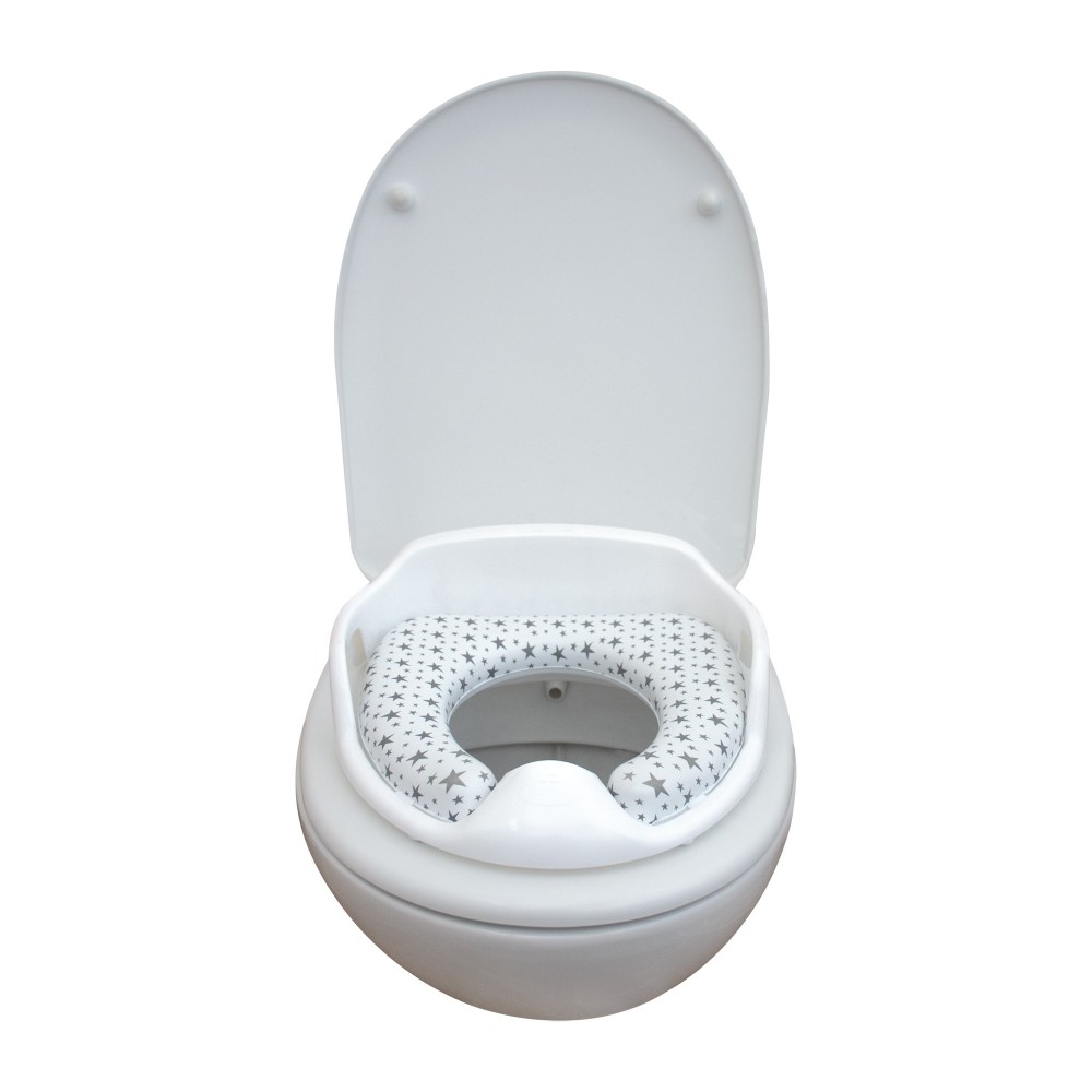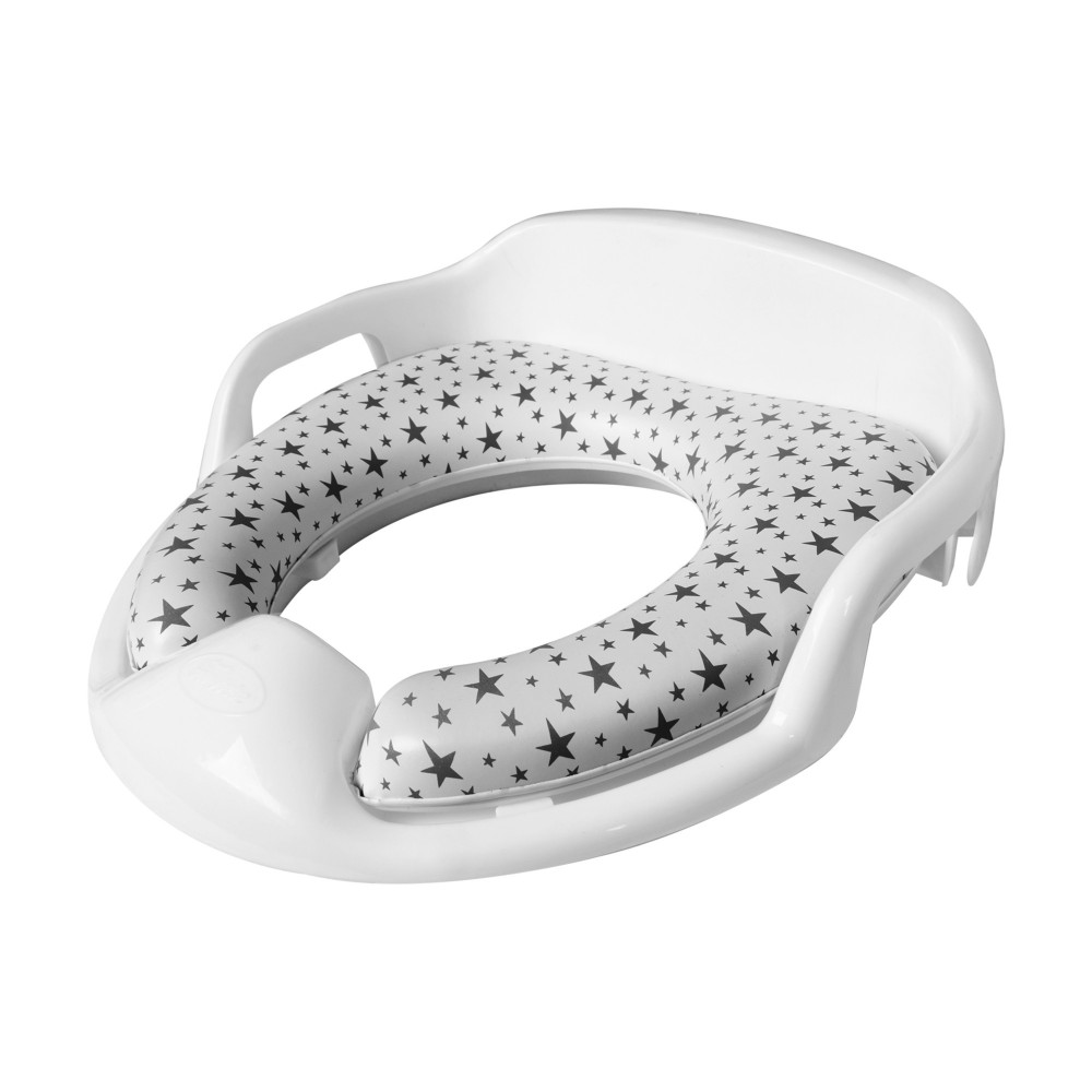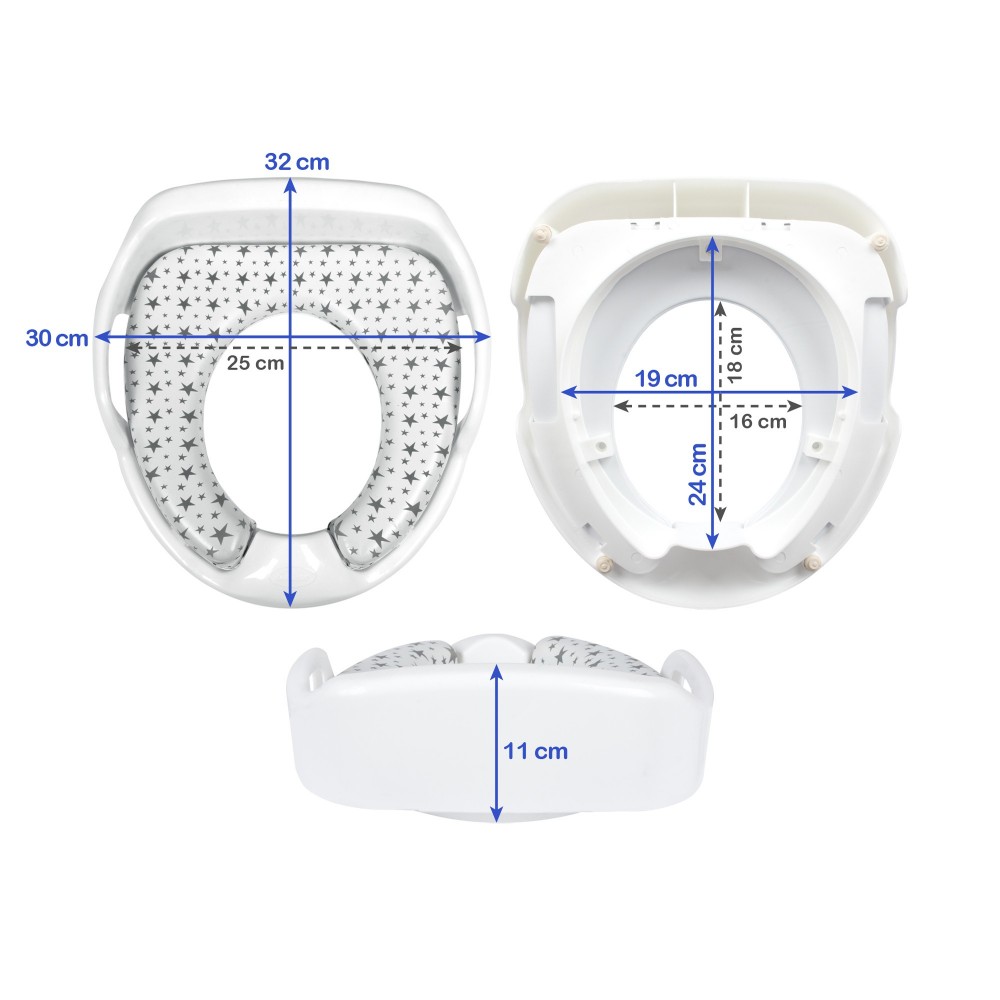 • Doux et confortable • Fond antidérapant • Soutien arrière • Les détenteurs mettent en sécurité • Hygiénique avec son siège amovible essuyable • Convient à toutes les tailles de toilettes. Dimensions: 30x32x11 cm • Ne contient pas de colorants azoïques, d’éléments toxiques. ATTENTION : Ce produit ne convient qu’aux enfants qui peuvent s’asseoir sans aide. Ne laissez jamais le bébé seul et sans surveillance lors de l’utilisation du produit