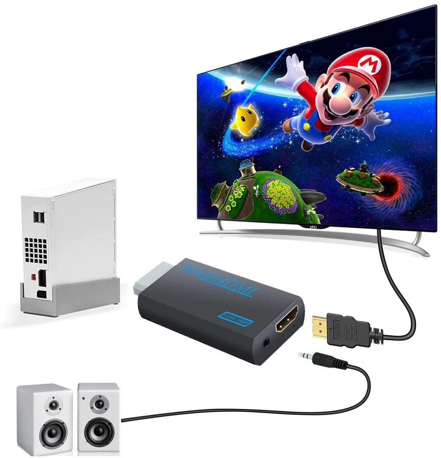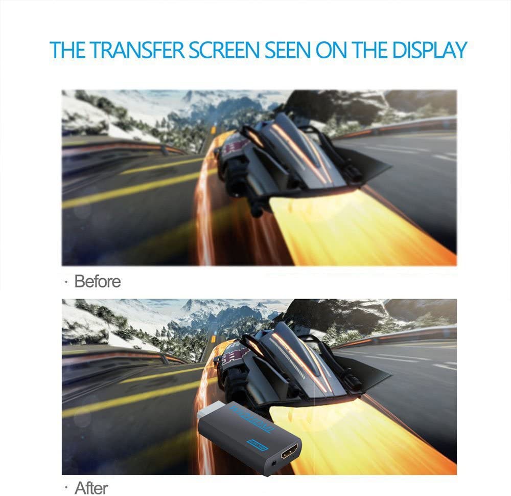 Compatibilité étendue : L'adaptateur prend en charge tous les modes d'affichage sur Wii, NTSC 480i, 480p et PAL 576i et transmet une qualité d'image nette. Vous n'avez pas à vous soucier de perte vidéo ou audio car la conversion est entièrement numérique. L'image est agrandie jusqu'à un maximum de 1080p. En plus de la transmission audio numérique via HDMI, l'audio peut également être émis via la sortie audio analogique 3,5 mm de l'adaptateur, pour une connexion à une chaîne stéréo ou à un haut-parleur.