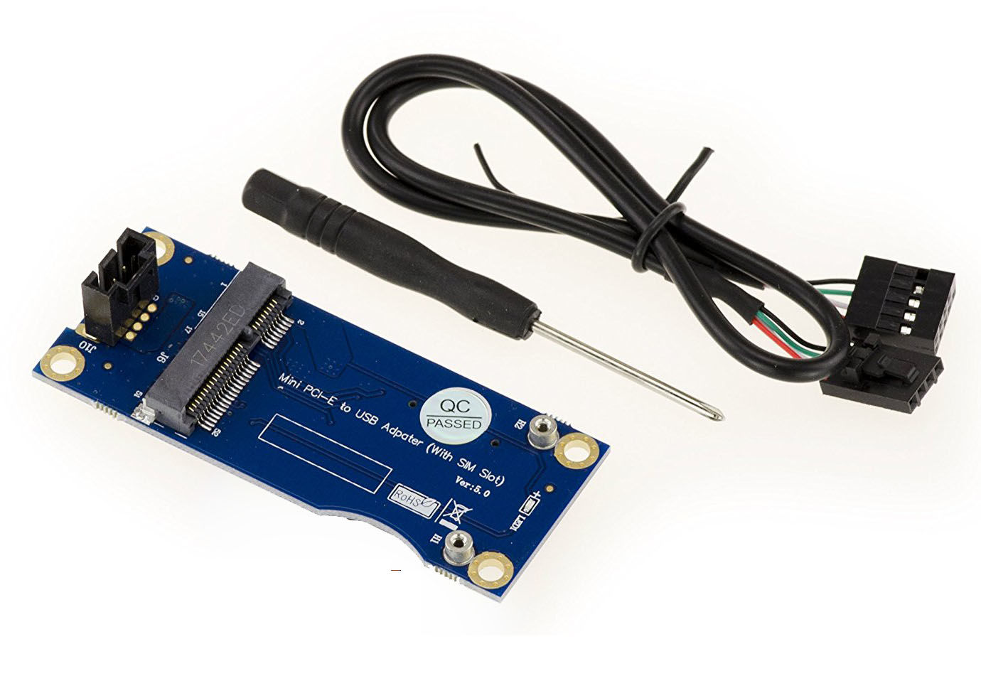 Adaptateur MiniPCIe vers USB 2.0 Pour carte Wireless Support carte SIM Utilisation : Va vous permettre d'utiliser une carte WWAN au format MiniPCIe sur un port USB 2.0. Compatibilité : Fonctionne sans pilotes, compatible tout système d'exploitation ( Windows 10, 8.1, 8, Windows 7, Linux, Mac etc...) Spécifications : Pour carte MiniCard MiniPCIe de type USB (ne conviendra pas pour les cartes MiniPCIe de type PCIe) Exemple de cartes supportées : 2G GSM, GPRS, 3G, CDMA, WLAN, WWLAN, HSPA MODEM, GPS, 4G WiMAX, LTE... mais ne supportera pas les modules MiniPCIe de type PCIe comme les modules WIFI par exemple. Compatible 3G et 4G Pas de pilote nécessaire pour cet adaptateur, vous aurez juste besoin des pilotes de votre carte WWAN. Port SIM pour carte SIM 6 ou 8 points. Vendu avec visserie, cordon USB et tournevis. ATTENTION / Connecteur USB pour prise de carte mère !. Article neuf et garanti 1 an, vendu sous boite.