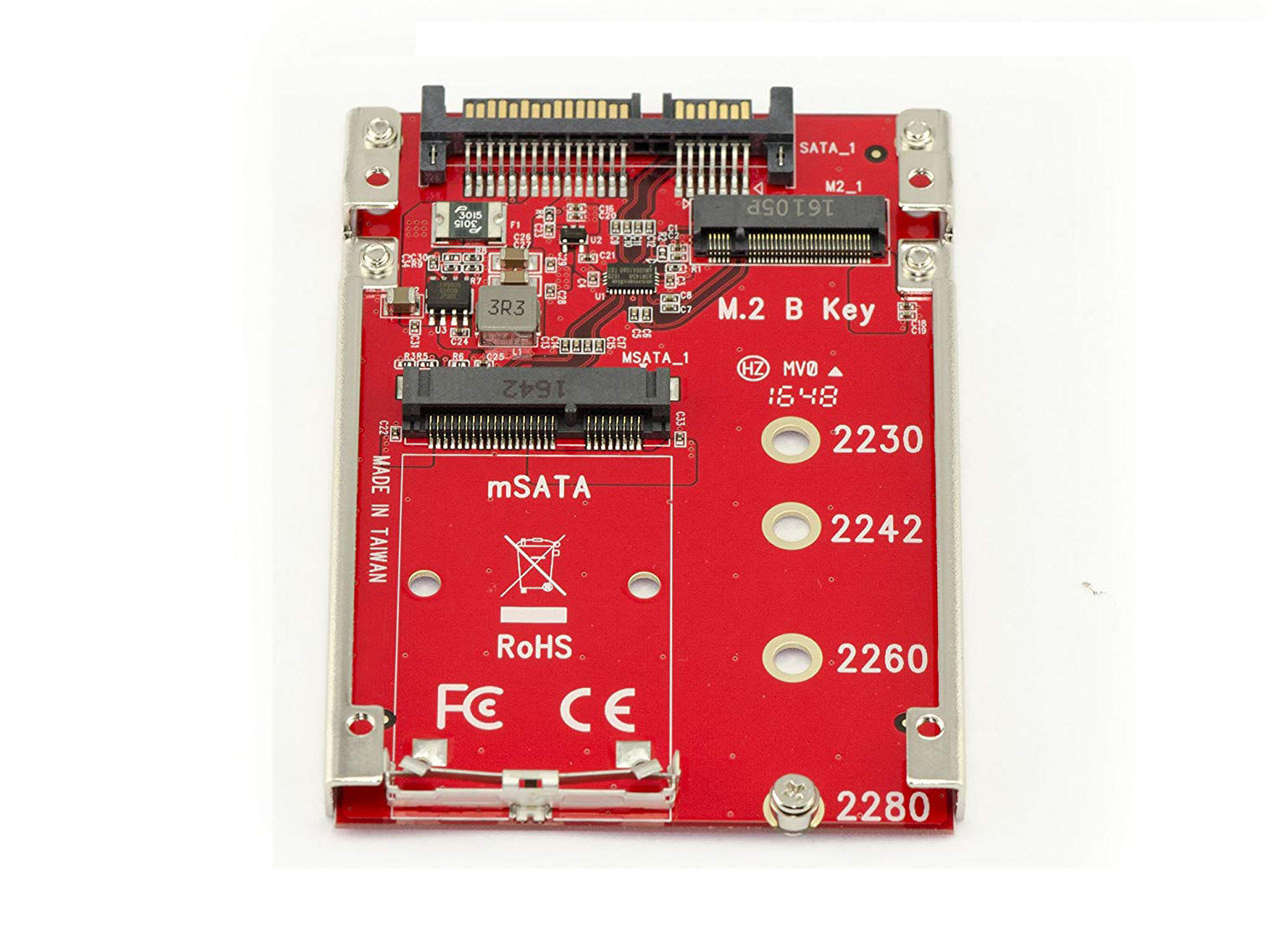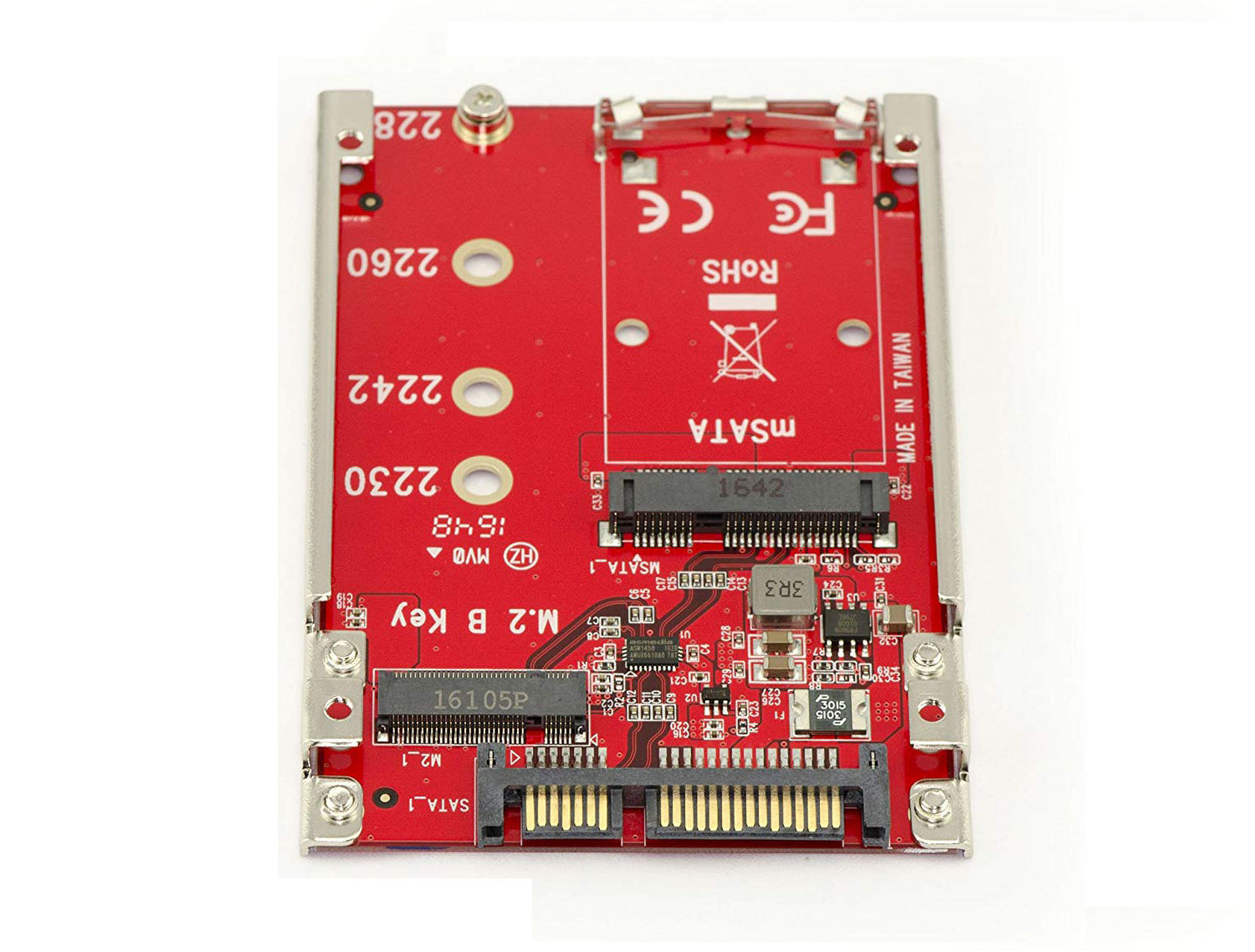 Carte M2 SATA et mSATA vers SATA Avec CHASSIS Gamme Professionnelle : Les composants de la gamme Pro offrent une qualité et des performances très haut dessus de la moyenne, pour passionnés exigeants et professionnels. En plus de leur qualités de conception et de finition, ces cartes offrent la particularité d'avoir des pilotes pré-installé dans leur puce de Bios, ainsi elles sont reconnues et installées automatiquement par votre PC ou MAC sans avoir recours à un CD de pilotes ou à un téléchargement sur internet (voir descriptif ci-dessous, les pilotes pré-installés pouvant varier selon les modèles) !. Caractéristiques : Conversion mSATA ou M2 SATA vers SATA avec chassis métal au format d'un disque 2.5"", Compatible mSATA full size et half size, et M2 SATA 2242/2260/2280, Compatible avec les SSD double face, Connecteur M2 type 2280-D5-B Bkey, Connecteur rapide mSATA full size, Connecteur SATA 22 broches (15+7), Carte bootable, Chassis au format d'un HDD 2.5"" avec emplacements pour visserie, 100.45mm x 69.85mm x 7mm, Transparent pour le systéme d'exploitation, pilotes inutiles, compatible tout OS (Windows, Mac, Linux...), Alimentation des SSD et de l'adaptateur depuis le connecteur SATA, Alimentation maximale des SSD 3.3V/4A, SSD M2 prioritaire sur le SSD SATA. Composants RoHS Features : Convert mSATA or M.2 SATA SSD to standard 2.5? SATA drive Form Factor Supports Full Size mSATA SSD or SATA based M.2 80mm, 60mm, 42mm, 30mm SSD Latch type mSATA connector on board, no need the screw for the retention of mSATA SSD M.2 NGFF type 2280-D5-B B Key connector on board Movable M.2 NGFF stand-off and multiple plated-holes supports type 2280, 2260, 2242 and 2230 SSD Supports dual-sided M.2 SSD module 1.5mm component height on the top and bottom side 100% Compatible with 2.5? SATA drive mechanical spec 22 pin SATA (Signals and Power) male connector on board mSATA or M.2 SATA SSD can be the primary bootable device containing the OS and application. Includes 2.5 ? drive metal frame with 8 mounting holes and 4 HDD screws. Dimension of PCBA with 2.5? frame : 100.45mm x 69.85mm x 7mm Transparent to the operating system and no driver required. Supports any OS like Windows, Mac and Linux SSD & PCBA power from 15Pin SATA 5V input. Provides Max 3.3V/4A power to SSD M.2 SSD active, if both M.2 & mSATA SSD installed