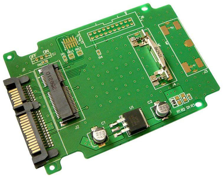 Adaptateur pour SSD mSATA vers SATA  3.0 Utilisation  : Pour monter une carte SSD mSATA (mini PCIe 52 points) de PC portable sur un PC de bureau ou un PC portable via un port SATA 7+15 points. Livré avec vis de fixation de la carte SSD.   Compatibilité  : Compatible avec les disques SSD suivants (liste non exhaustive, supportera tous les SSD de type mSATA)  :   Marque Type INTEL INTEL Solid-State Drive 311 Series (SLC) SSDMAESC020G201 INTEL Solid-State Drive 310 Series (MLC) SSDMAEMC080G2C1 SSDMAEMC040G2C1 SAMSUNG PM830 Series 256GB MZMPC256HBGJ-0000 128GB MZMPC128HBFU-0000 64GB MZMPC064HBDR-0000 32GB MZMPC032HBCD-0000 SAMSUNG PM810 Series 128GB MZMPA128HMFU-00000 64GB MZMPA064HMDR-00000 32GB MZMPA032HMCD-00000 SAMSUNG PM800 Series 64GB MMDPE64GEDXP-MVB 32GB MMCRE32GEDXP-MVB 16GB MMBRE16GEDXP-MVB Toshiba SG2 Series mSATA Module Series (32nm MLC) 128GB THNSNB128GMCJ 62GB THNSNB062GMCJ 30GB THNSNB030GMCJ Toshiba HG Series(56nm MLC) 8GB THNSA08G0P4L 16GB THNSA16G1P4L 32GB THNSA32G1P4L Sandisk P4 mSATA 32nm Meteor5 (MLC)--> Full size 8GB SDSA4DH-008G 16GB SDSA4DH-016G 32GB SDSA4DH-032G 64GB SDSA4DH-064G Sandisk P4 mSATA mini 32nm Meteor5 (MLC)--> Half size 16GB SDSA4FH-016G 32GB SDSA4FH-032G 64GB SDSA4FH-064G Sandisk Gen 2 pSSD mSATA 43nm Athen5 (MLC) 8GB SDSA3DD-008G 16GB SDSA3DD-016G 32GB SDSA3DD-032G 64GB SDSA3DD-064G Renice X3 50mm mSATA (Mini PCI-E form 25GB RCM025-PX3M 60GB RCM060-PX3M 120GB RCM120-PX3M Marque Type InnoDisk InnoDisk mSATA D150Q Series (SLC) 2GB DRPS-02GJ30A 4GB DRPS-04GJ30A 8GB DRPS-08GJ30A 16GB DRPS-16GJ30A 32GB DRPS-32GJ30A InnoDisk InnoDisk mSATA J80 Series (SLC) InnoDisk InnoDisk EverGreen mSATA Series (MLC) Transcend mSATA SSD (MLC) 16GB TS16GMSA300 32GB TS32GMSA300 64GB TS64GMSA300 2GB TS2GMSA500 4GB TS4GMSA500 8GB TS8GMSA500 16GB TS16GMSA500 PQI S903 Series mSATA SSD Kingfast KF1307MCS Series 16GB KF1307MCS MLC (16GB) 32GB KF1307MCS MLC (32GB) 64GB KF1307MCS MLC (64GB) 128GB KF1307MCS MLC (128GB) Super Talent CoreStore MV Series 16GB SR16C6MME (MLC) 32GB SR16C7MME 64GB SR16C8MME 128GB SR16C9MME 16GB SR16D6MME (SLC) 32GB SR16D7MME 64GB SR16D8MME Super Talent mSATA (MO-300B) 16GB SG16N75SM 32GB SG32N75SM 64GB SG64N75SM 128Gb SG28N75SM Yuanyi SSD-mSATA605-xx Series 8GB SSD-mSATA605-08 16GB SSD-mSATA605-16 32GB SSD-mSATA605-32 64GB SSD-mSATA605-64 SunSpeed HY-7000 3CM×7CM HY-7000 3CM×5CM Active Saber Tooth M1 64GB N64G-MSATA 32GB N32G-MSATA 16GB N16G-MSATA Active Saber Tooth MP 64GB N64G-MINIPCIE 32GB N32G-MINIPCIE 16GB N16G-MINIPCIE     Spécifications  : Interface SATA de type SATA3 (compatible SATA 1 et 2 également) Compatible SATA revision 3.0, avec connecteur standard 7 + 15 points Pour SSD PCIe de type mSATA en 3.3V Connecteur mini PCI-e 52 points Supporte les dimensions de cartes suivantes : 50.95 mm(L) x 30 mm (W)   Article neuf et garanti 1 an, vendu sous sachet antistatique avec vis de fixation pour tenir le SSD sur la carte.