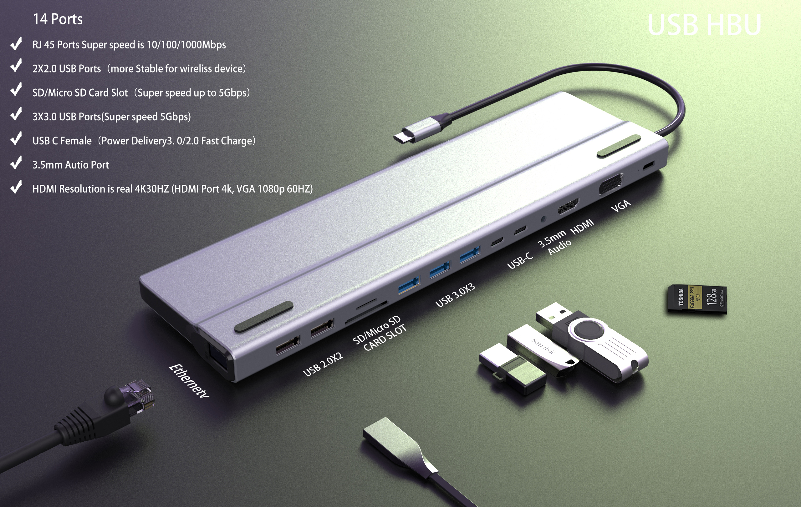 | Libellé | Adaptateur multiport USB-C 14 en 1 avec HDMI, VGA, Ethernet, lecteur de carte SD/TF |
