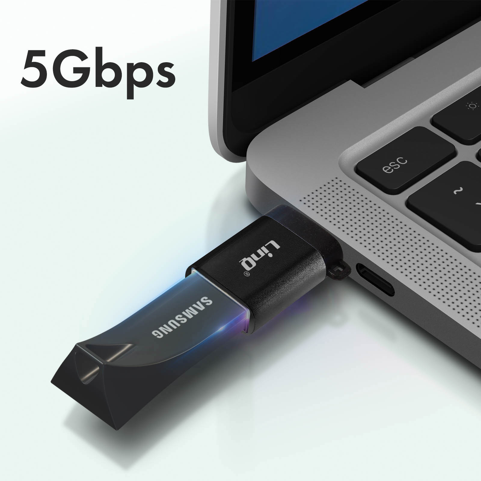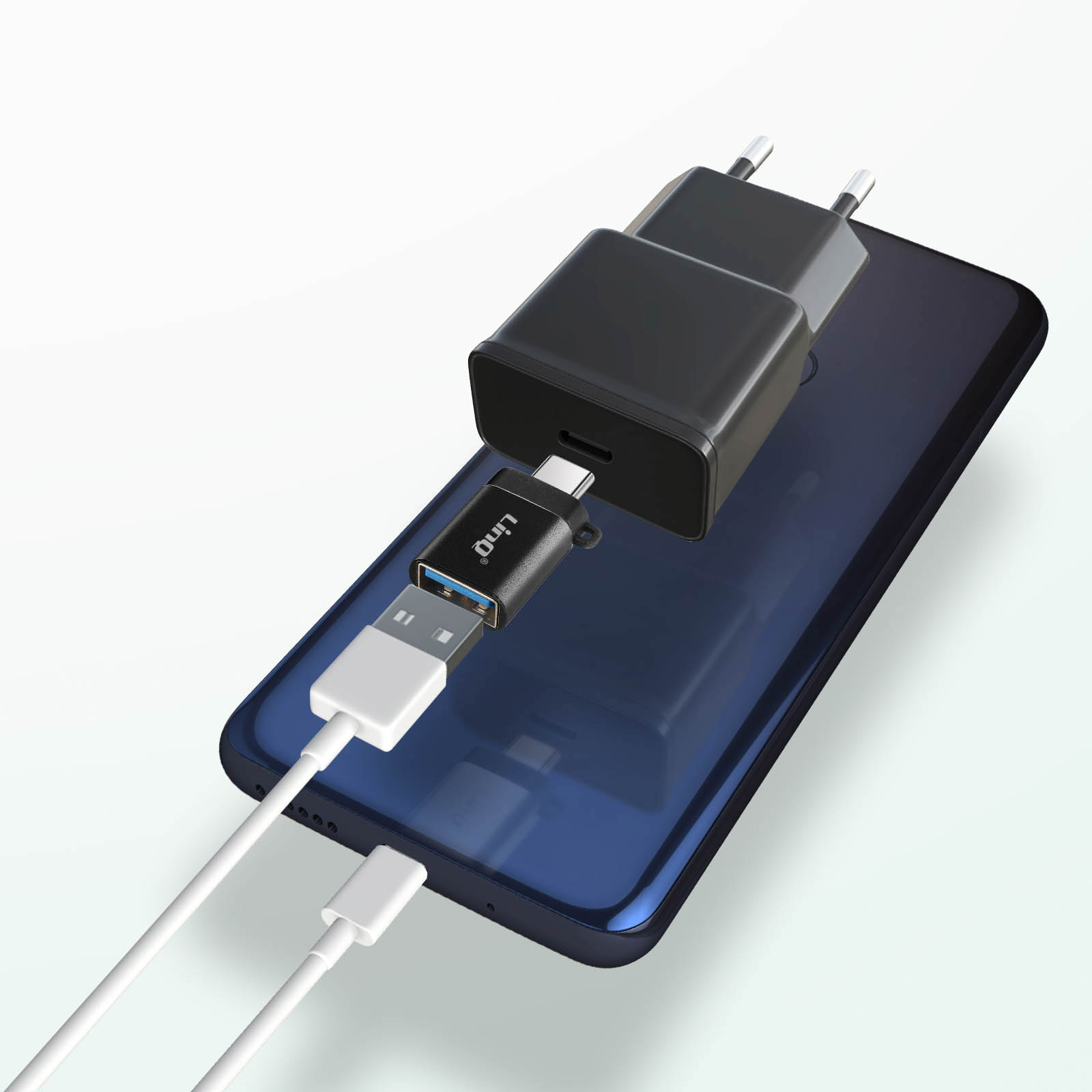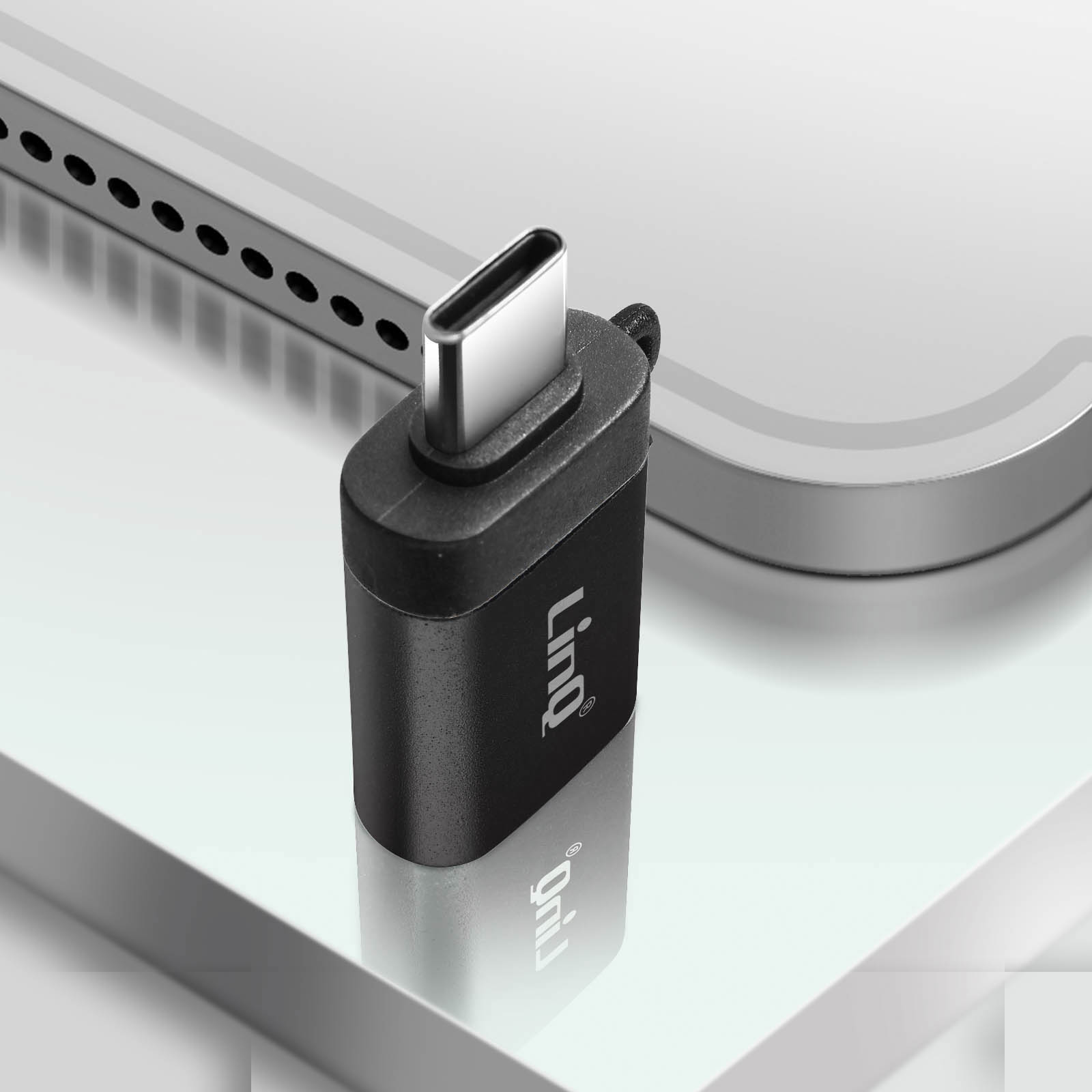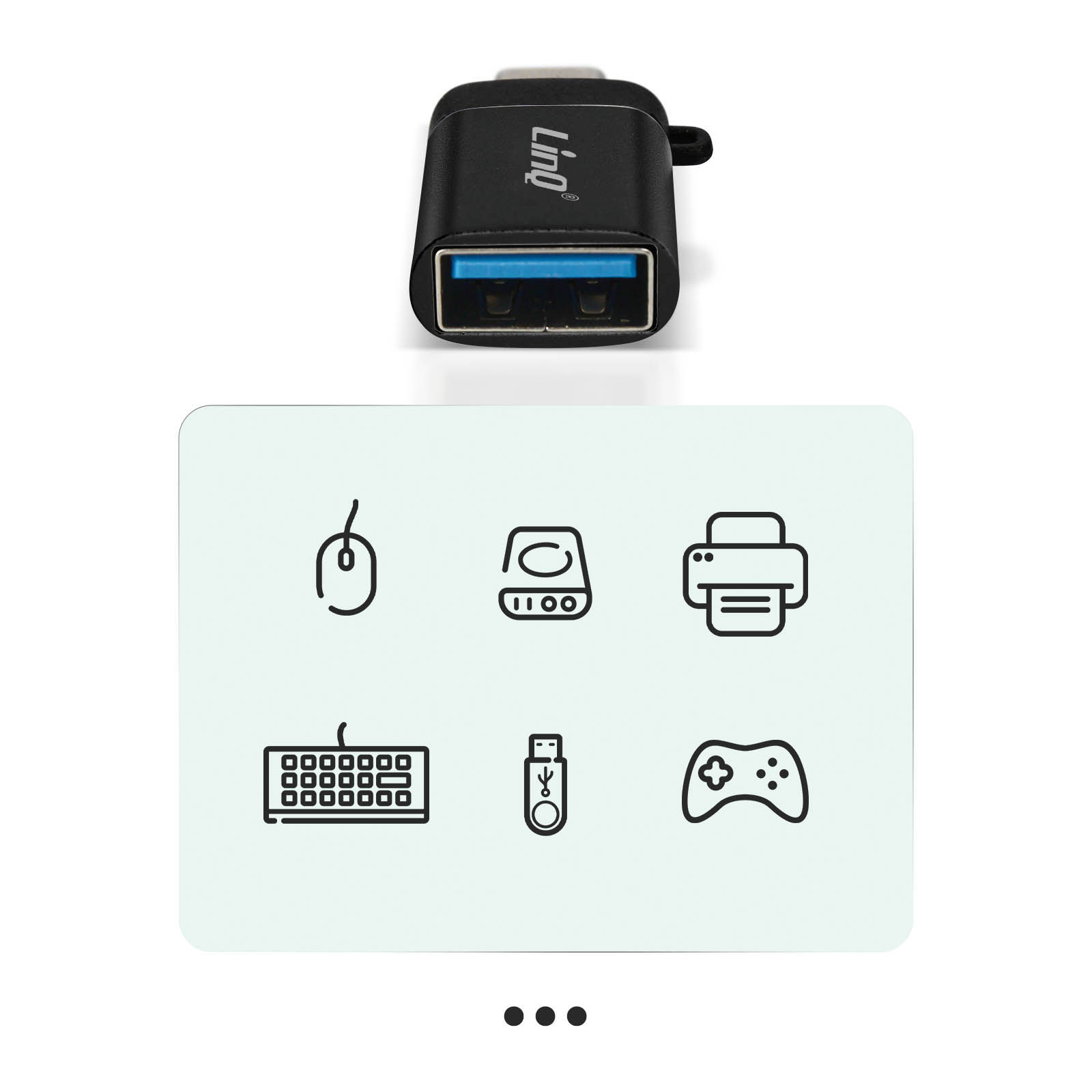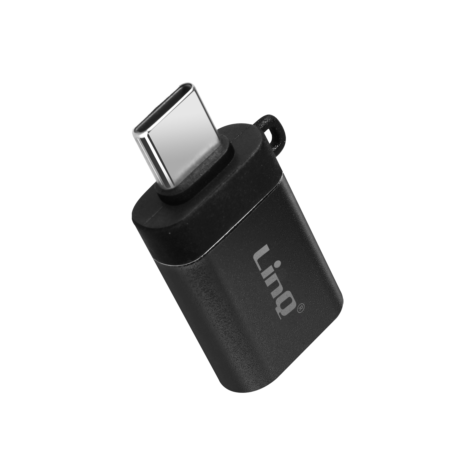 Mini adaptateur USB-C vers USB OTG 3.0, LinQ. Permet de connecter des périphériques USB à votre appareil : clé USB, souris, clavier, manette de jeu etc. Prend également la fonction charge d'un chargeur ou powerbank USB. Design ultra-compact avec dragonne.