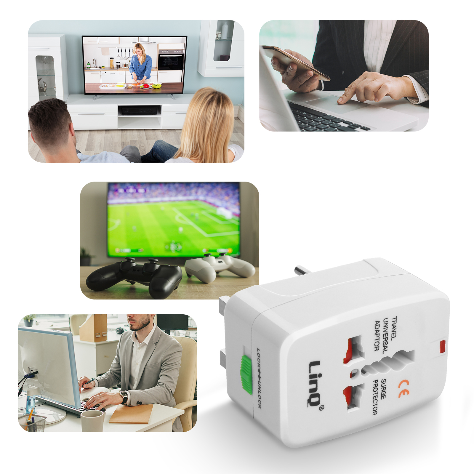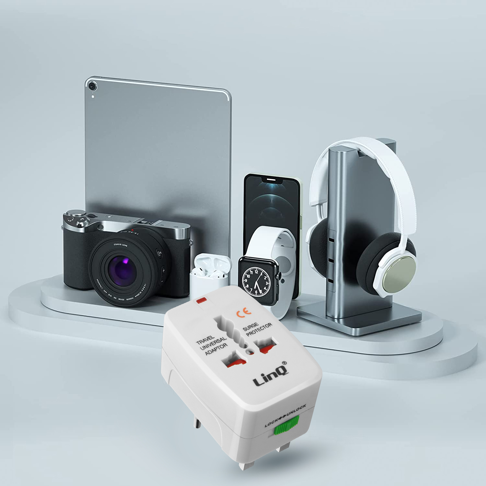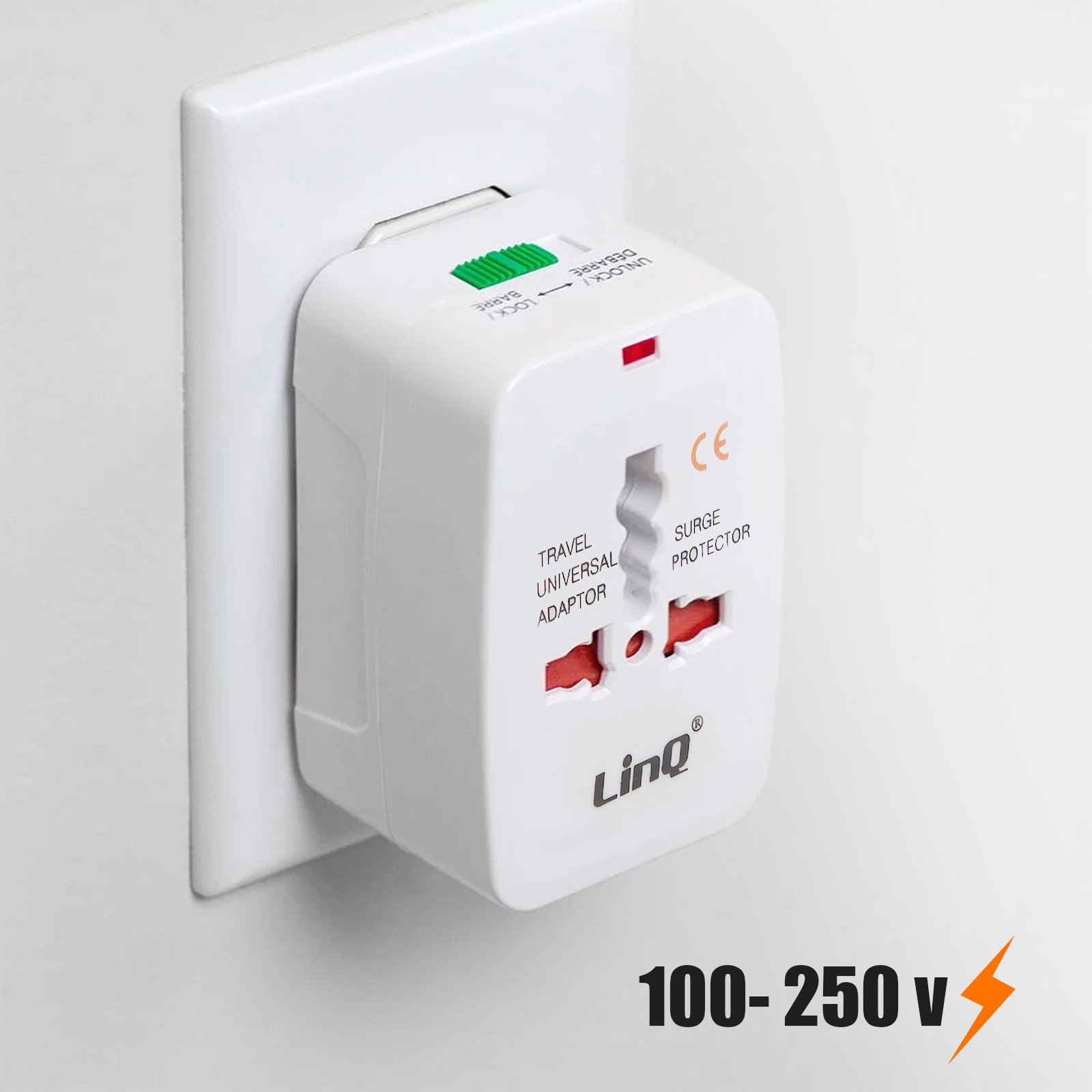 Adaptateur secteur de voyage de LinQ. Dispose de 3 fiches UK / EU / US le rendant compatible dans plus de 150 pays du monde. Conception sécurisée et de qualité. Voyant LED intégré. Format compact 4 x 5 x 7.4 cm - 90g. Tension de sortie 110 - 250V.