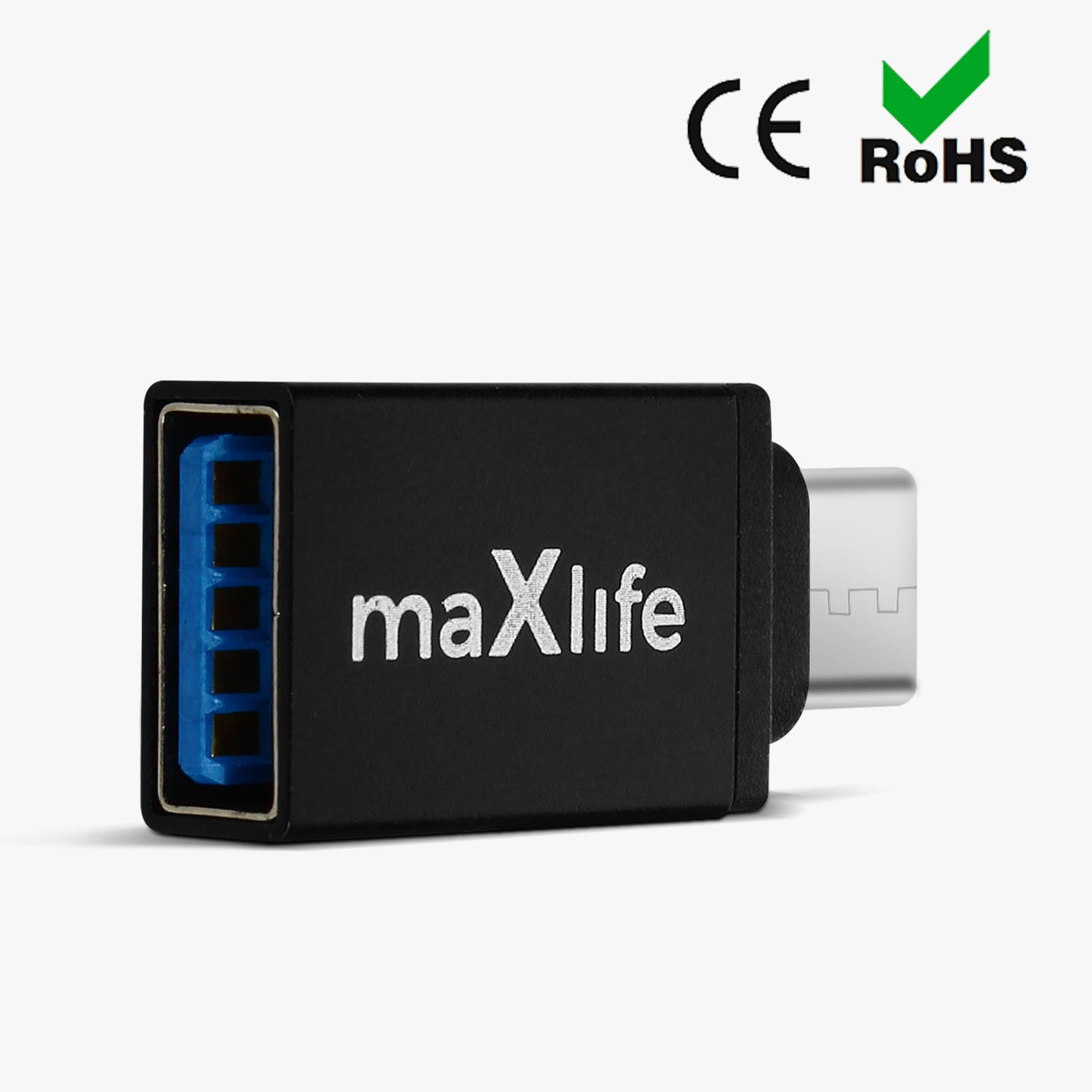 Adaptateur USB 3.0 vers USB-C de Maxlife pour utiliser vos périphériques et câbles USB sur un port USB-C. Ultra-compact pour faciliter votre utilisation. Permet la recharge 2A et la synchronisation. Pas de configuration nécessaire. Format compact.