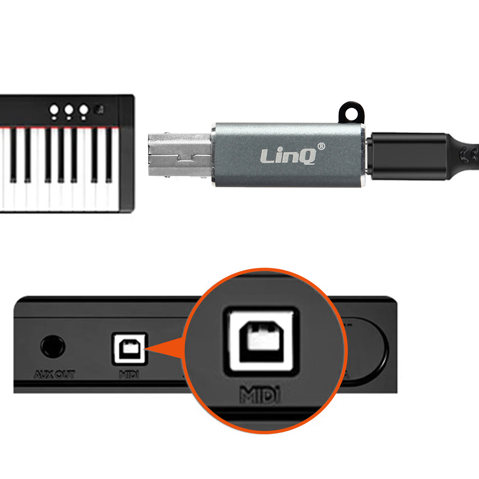 Adaptateur USB-C femelle vers USB-B male de LinQ. Permet d'établir une connexion entre votre appareil USB-C et vos périphériques USB-B : Imprimante, Synthé et Table de Mixage, etc. Fonction Notebook. Supportant les signaux MIDI. Utilisation Plug and Play.