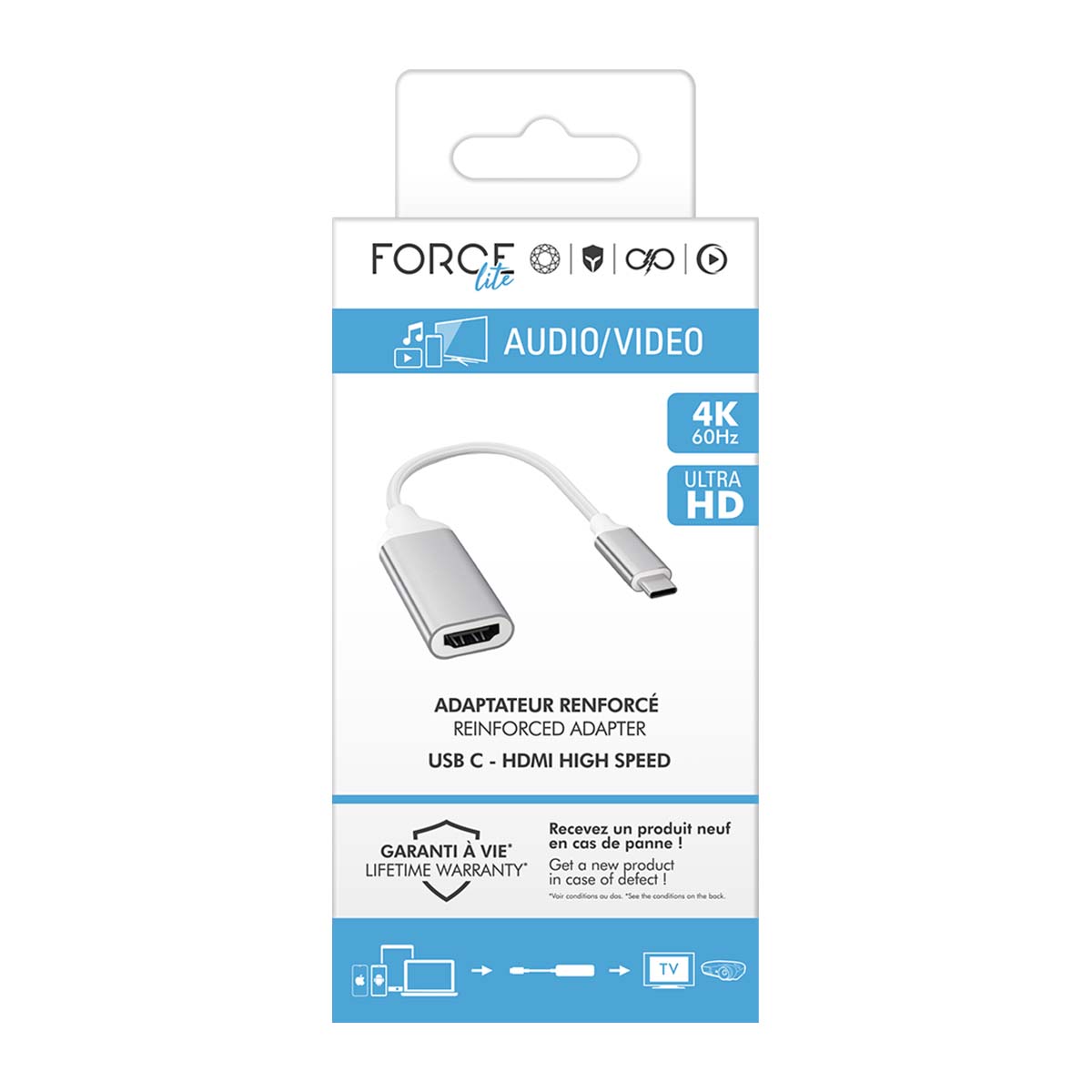 | Accessoires inclus | 1x Adaptateur USB-C vers HDMI 4K Ultra HD renforcé Force Lite blanc |