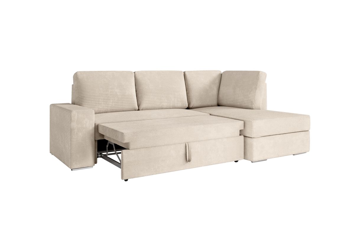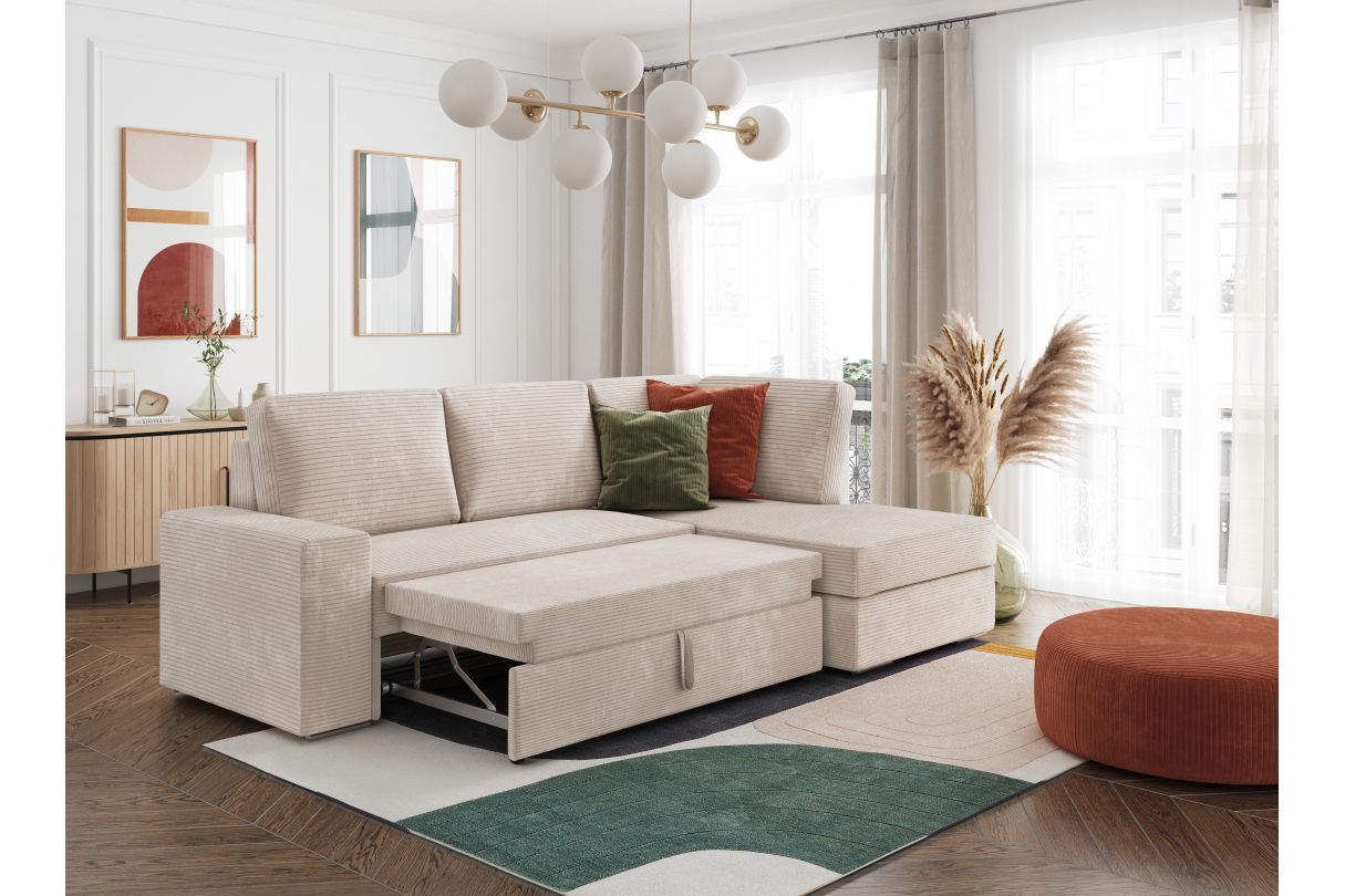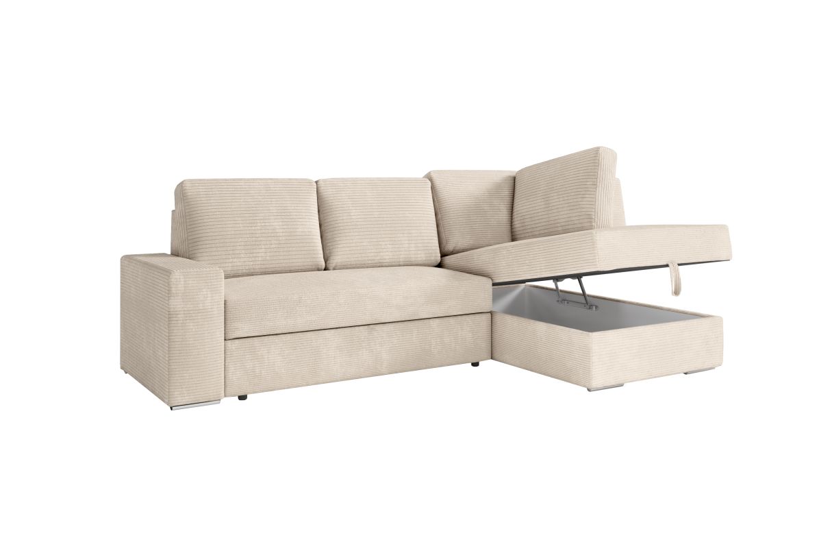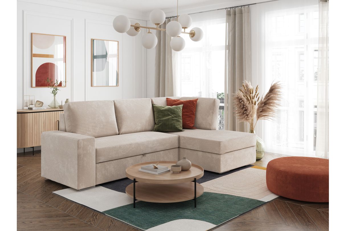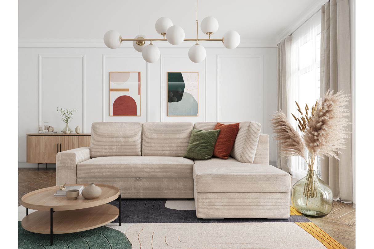 ADEN - Canapé d'angle convertible avec coffre en velours côtelé - Beige - Angle Droit