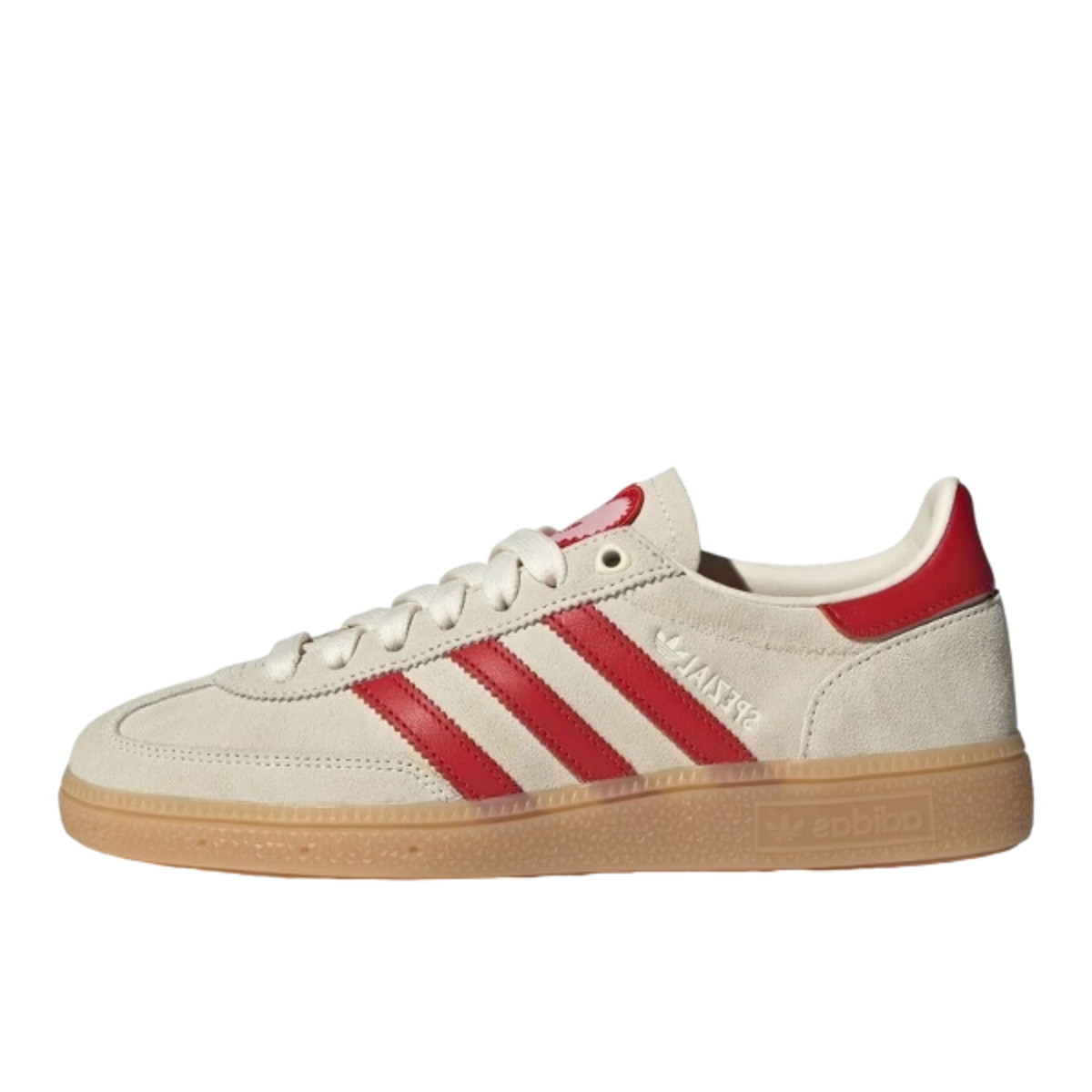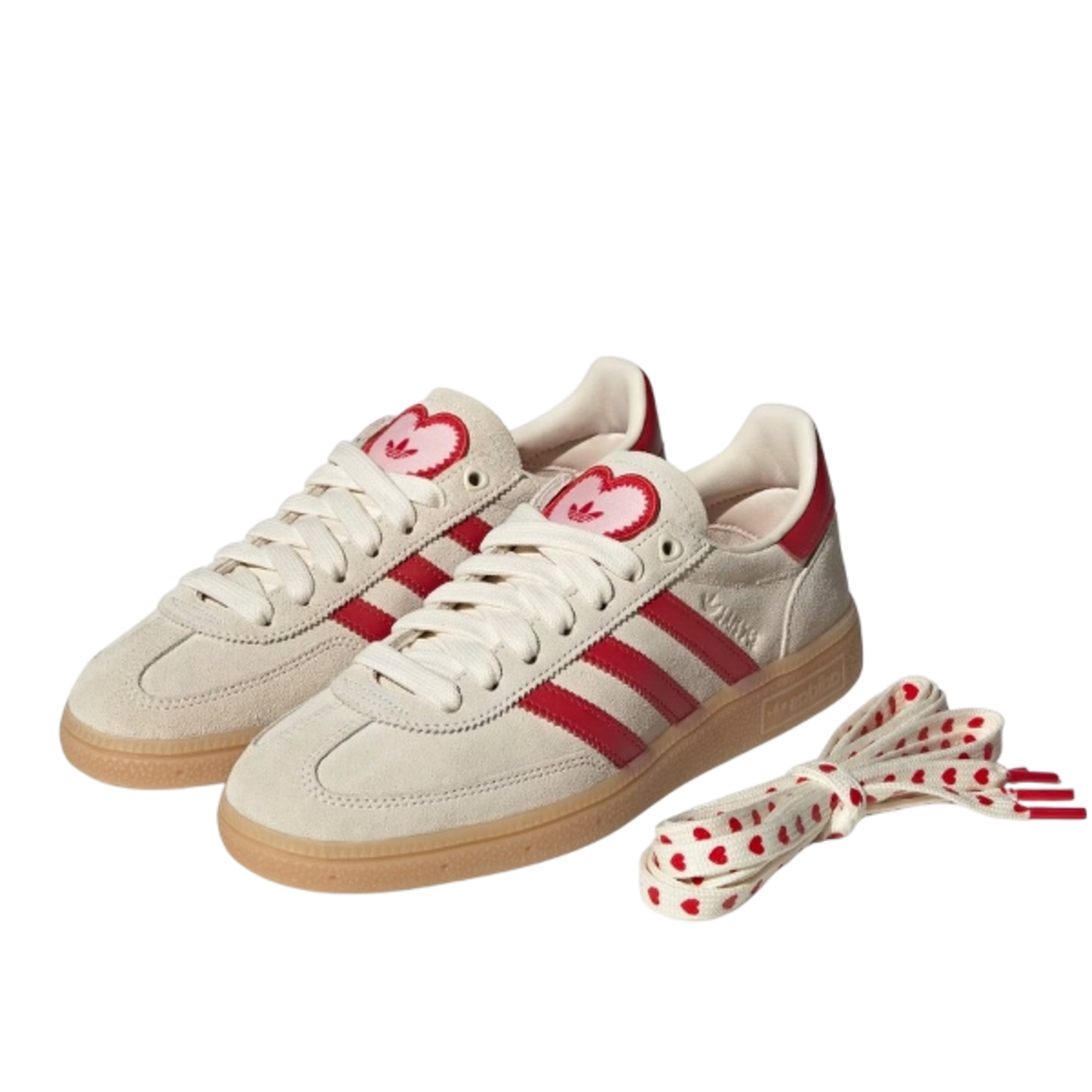 Le modèle Adidas Handball Spezial Valentine's Day (2026) taille légèrement petit, l'équipe Limited Resell vous recommande de prendre une demi-taille au dessus de votre pointure habituelle. Date de sortie : 15/01/2026 SKU : KH9044 Coloris : Cream White/Better Scarlet/Sandy Pink