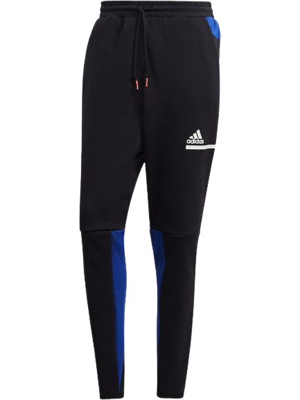 Pantalon de jogging Adidas pour homme, coupe slim, taille élastique avec cordon de serrage, 2 poches sur les côtés et 1 à l'arrière et empiècements bleus sur l'arrière. On retrouve le logo sur la jambe à l'avant et sur la poche arrière.