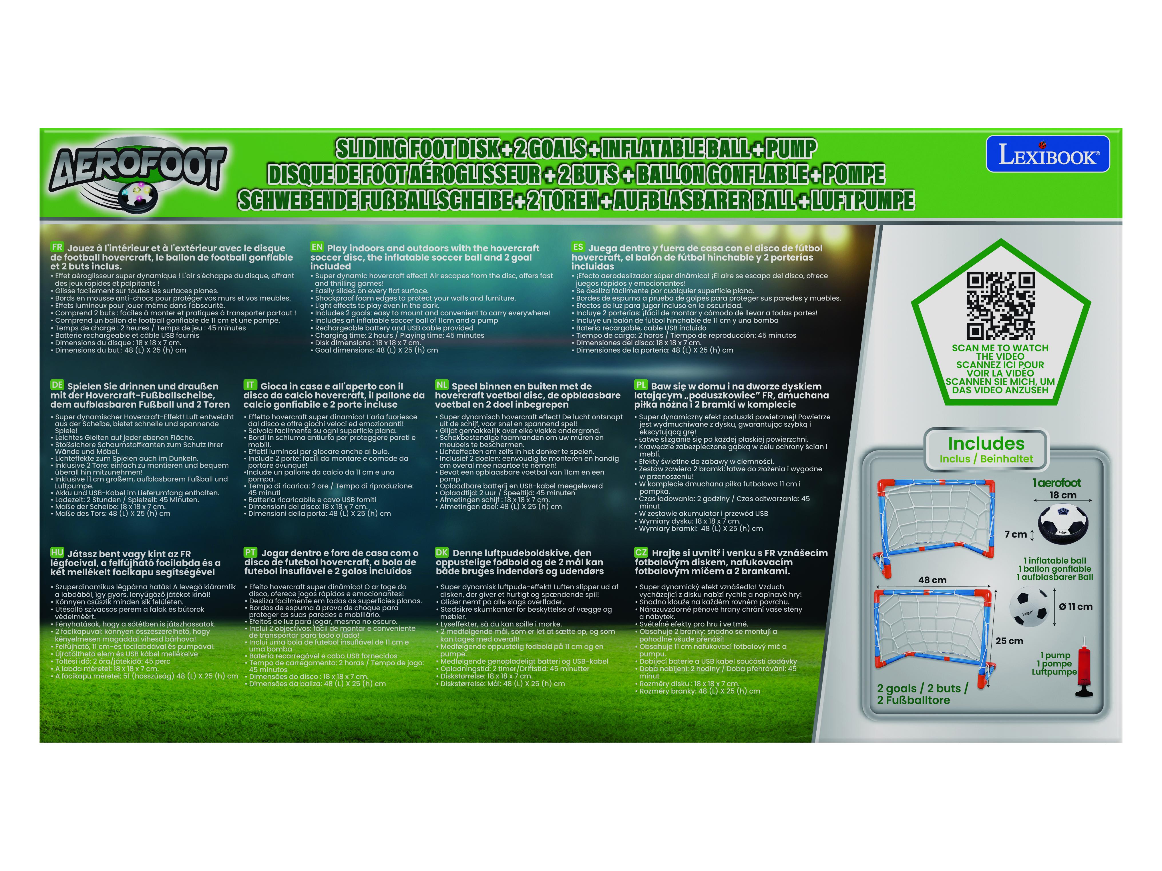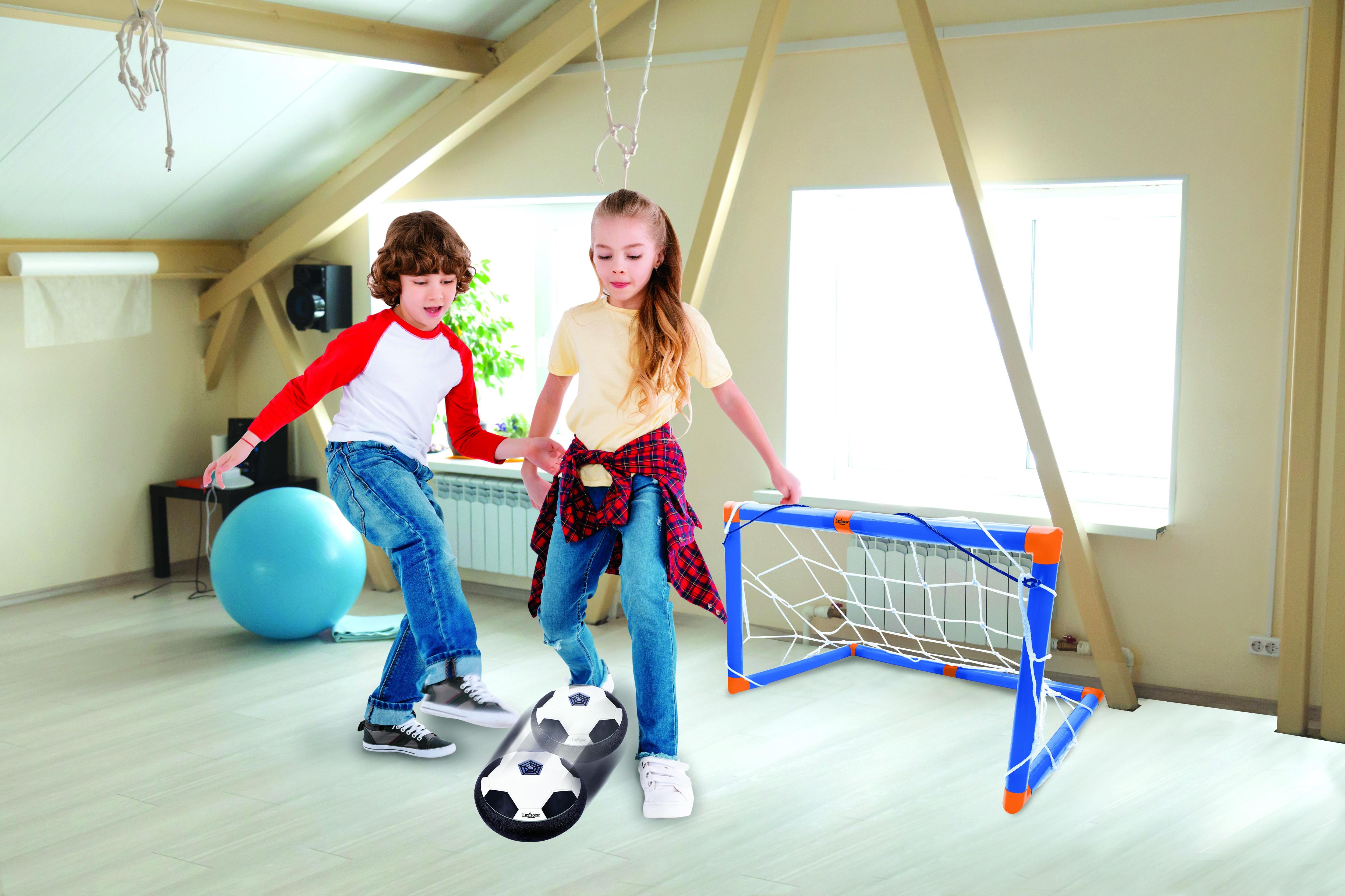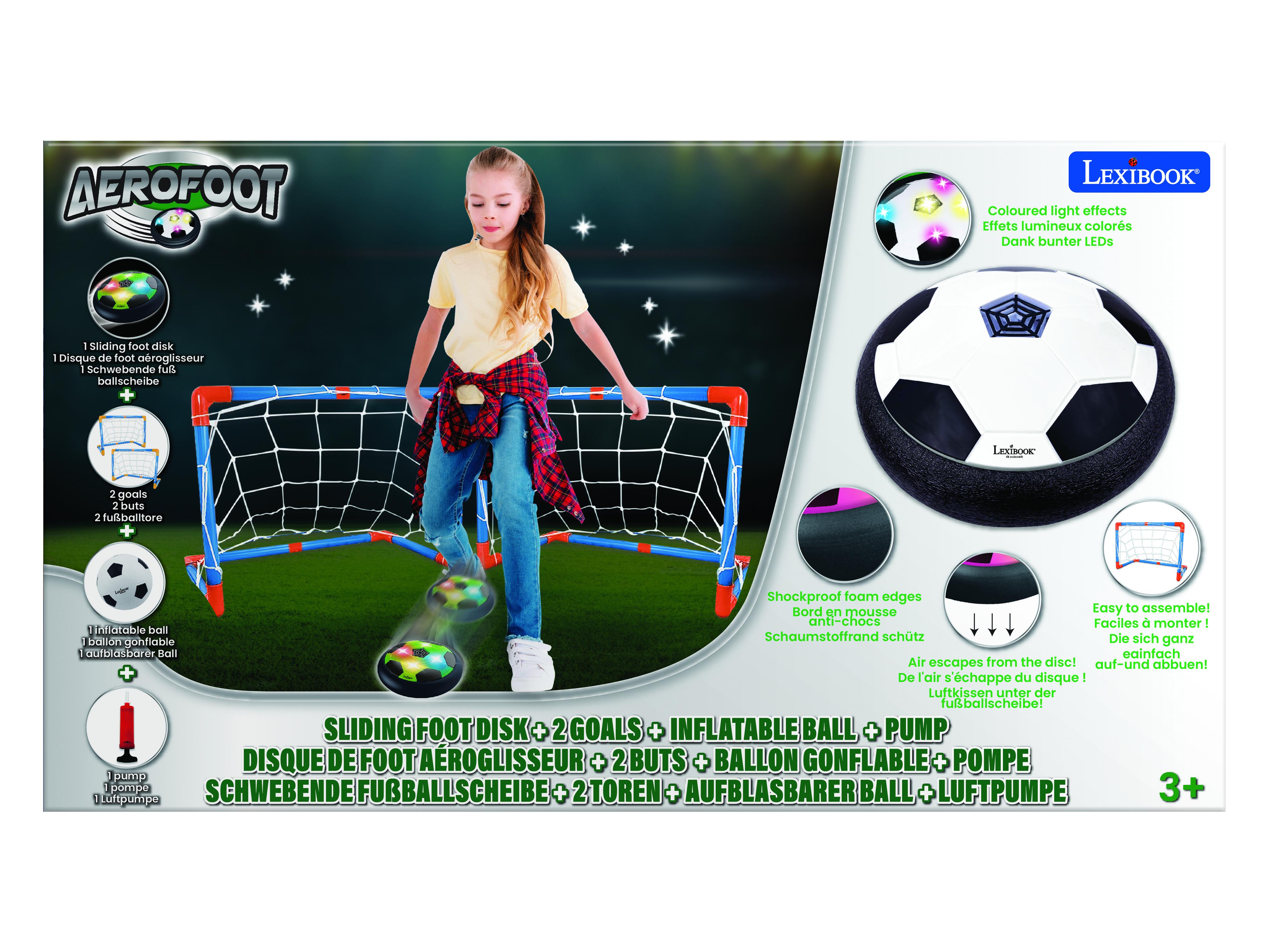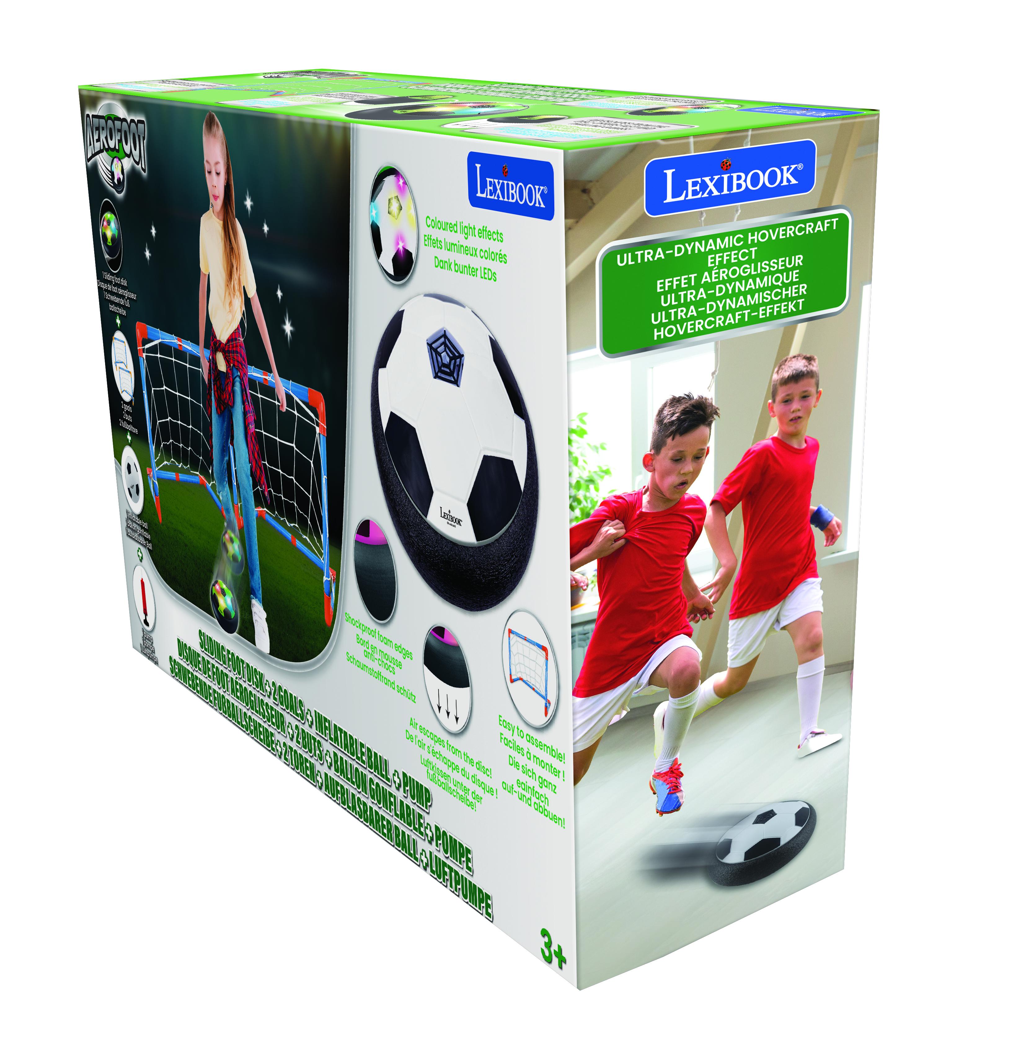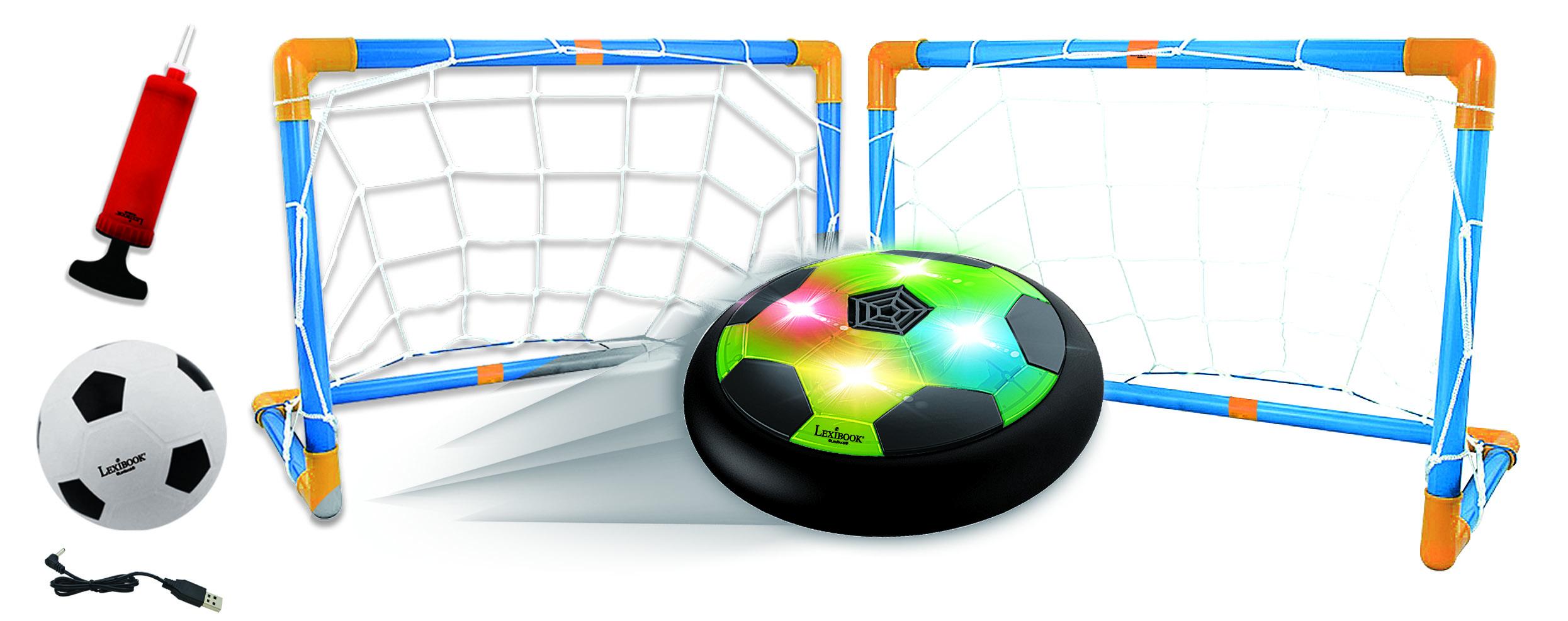 * Effet aéroglisseur super dynamique ! De l'air s'échappe du disque pour des parties rapides et endiablées ! * Glisse facilement au sol sur toute surface plane. * Bords en mousse anti-chocs : assure une protection pour les murs et les meubles. * Effets lumineux colorés pour jouer même dans l'obscurité. * Inclus 2 buts : facile à monter et pratique à emporter partout ! * Inclus un ballon de foot et une pompe * Rechargeable