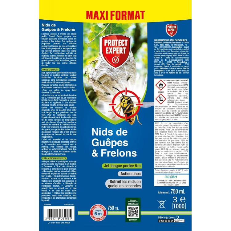 | Libellé | Aérosol 750ml Nids de Guêpes et Frelons Maxi Format de PROTECT EXPERT - GUEP750 |