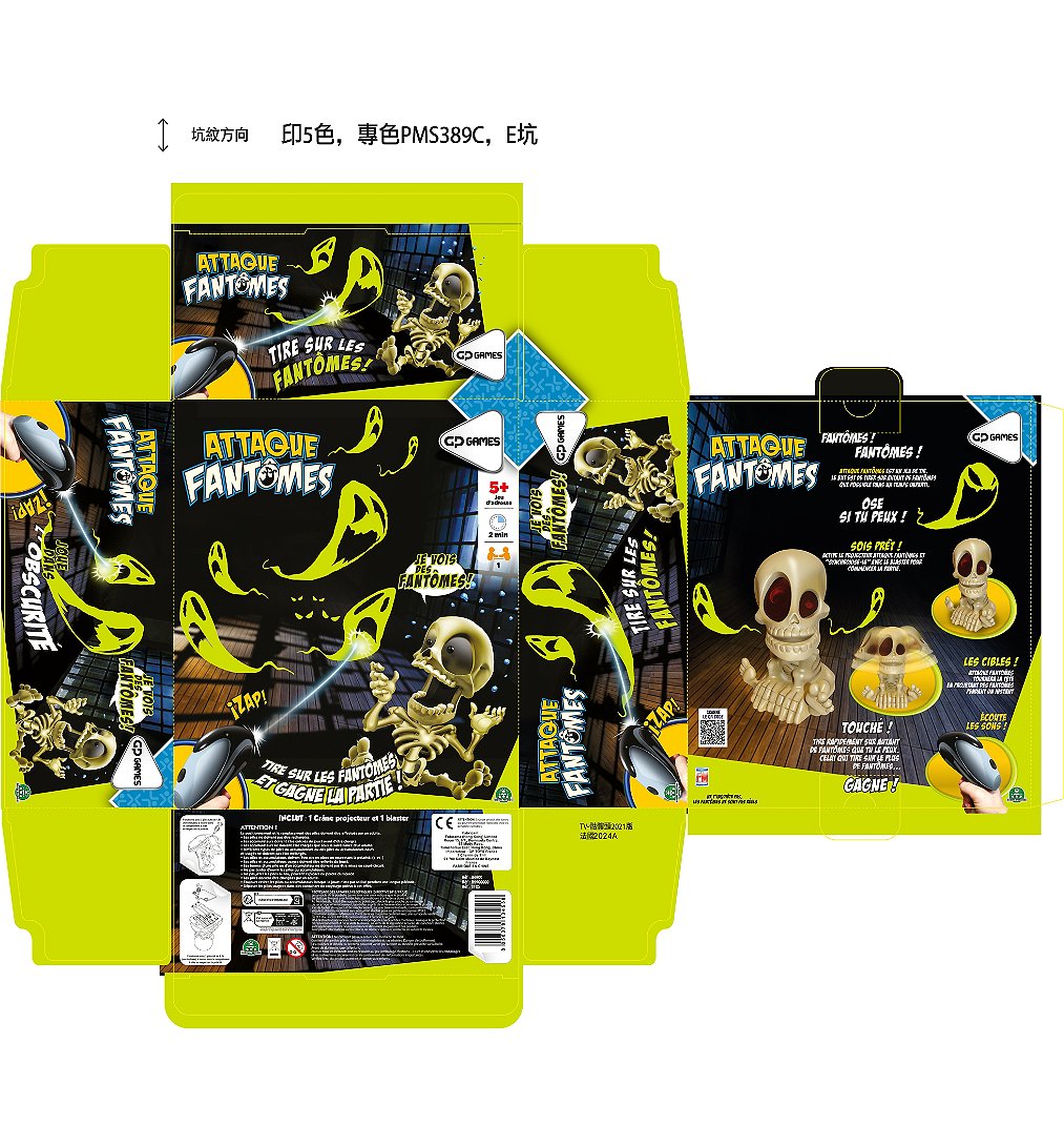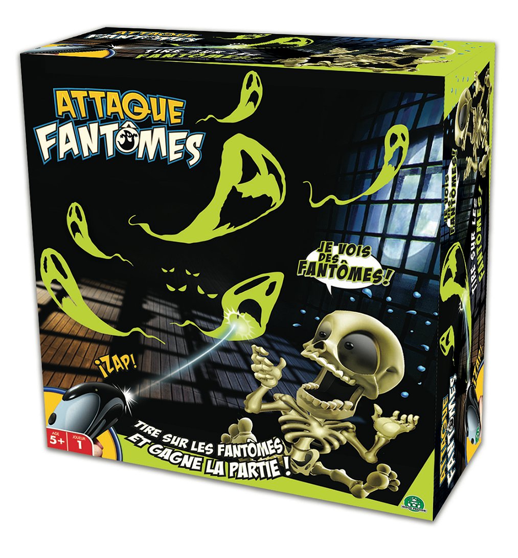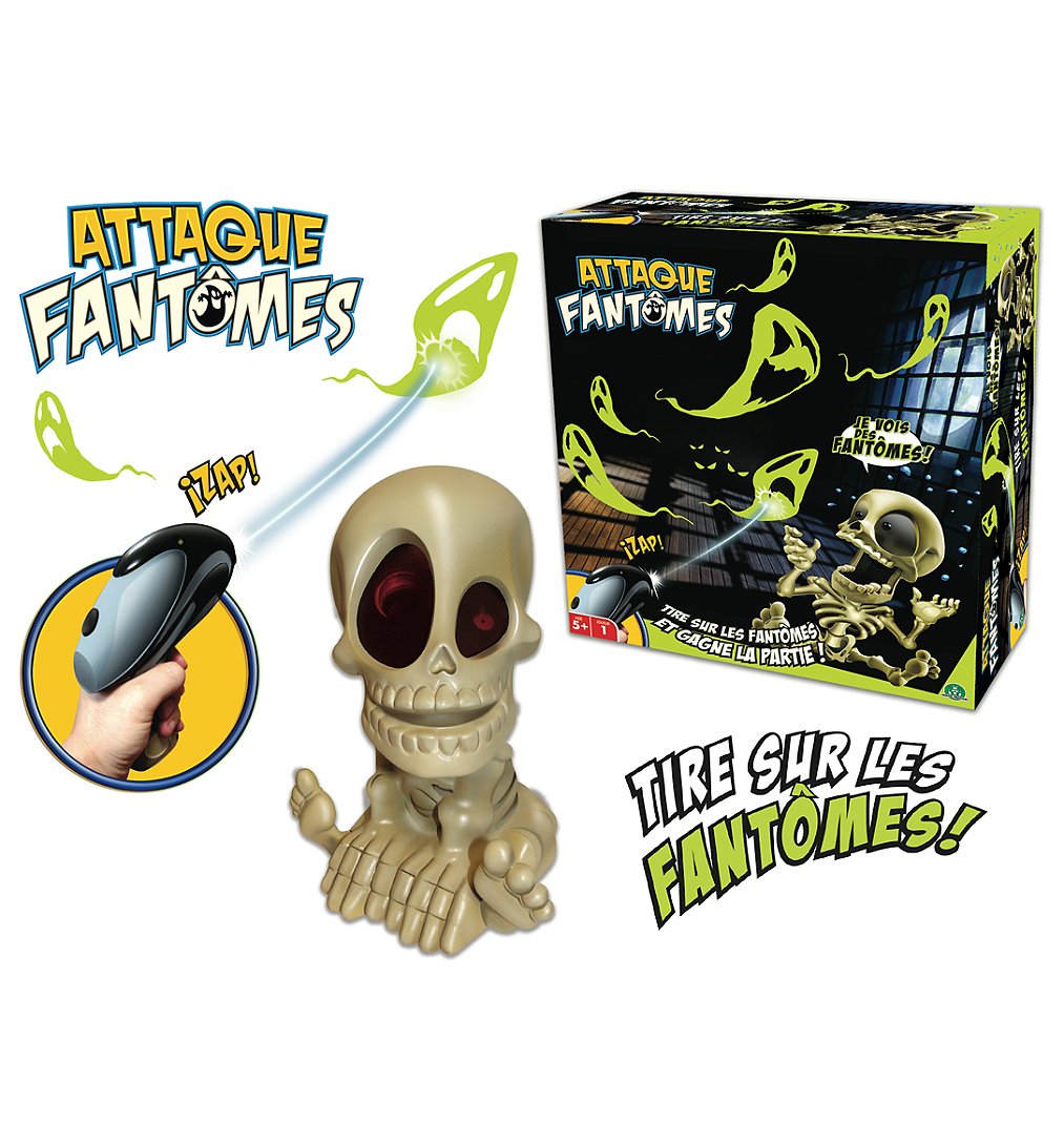Attaque Fantôme. Pour gagner, tu dois toucher un maximum de fantômes avec ton blaster ! Plusieurs niveaux de jeu. Inclut : Crane projecteur, Blaster, (Piles non incluses) Inclut : Crane projecteur, Blaster, (Piles non incluses)