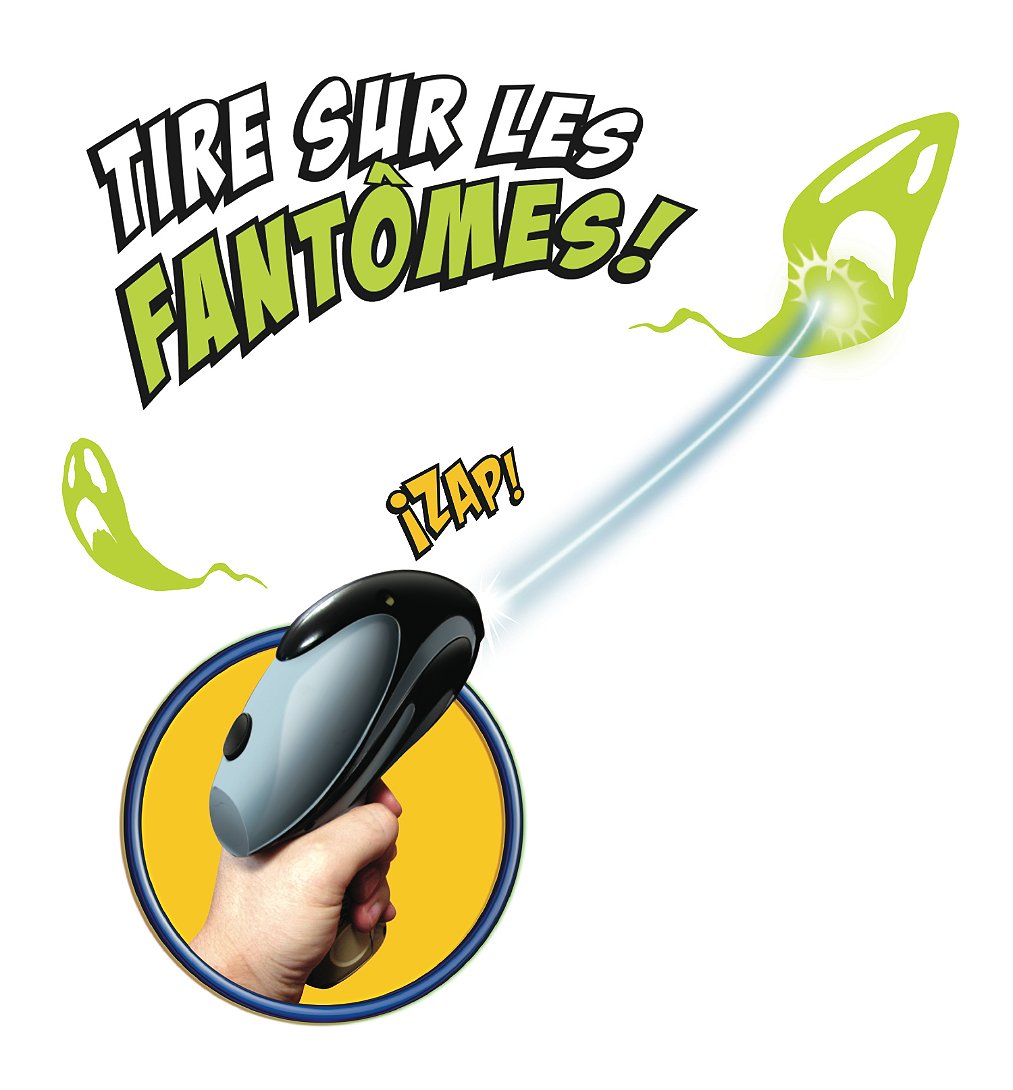| Plus produit | POUR GAGNER : Elimine le plus grand nombre de fantômes. NIVEAU : 3 niveaux de difficulté pour plus de jeu. La durée de la partie de 2 min. ELECTRONIQUE : Projection de cible sur les murs avec effets spéciaux et annonce du score. PILES : \nProjecteur : 3 x AA (non incluses)\nBlaster : 3 x AAA\n(non incluses) ACCESSOIRES : 1 x Projecteur + 1 x Blaster NOMBRE JOUEUR PENDANT LA PARTIE : 1 AGE : A partir de 5 ans et plus |