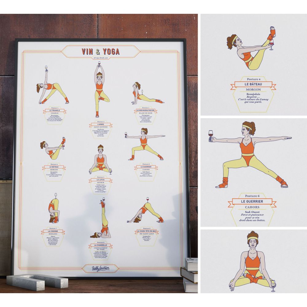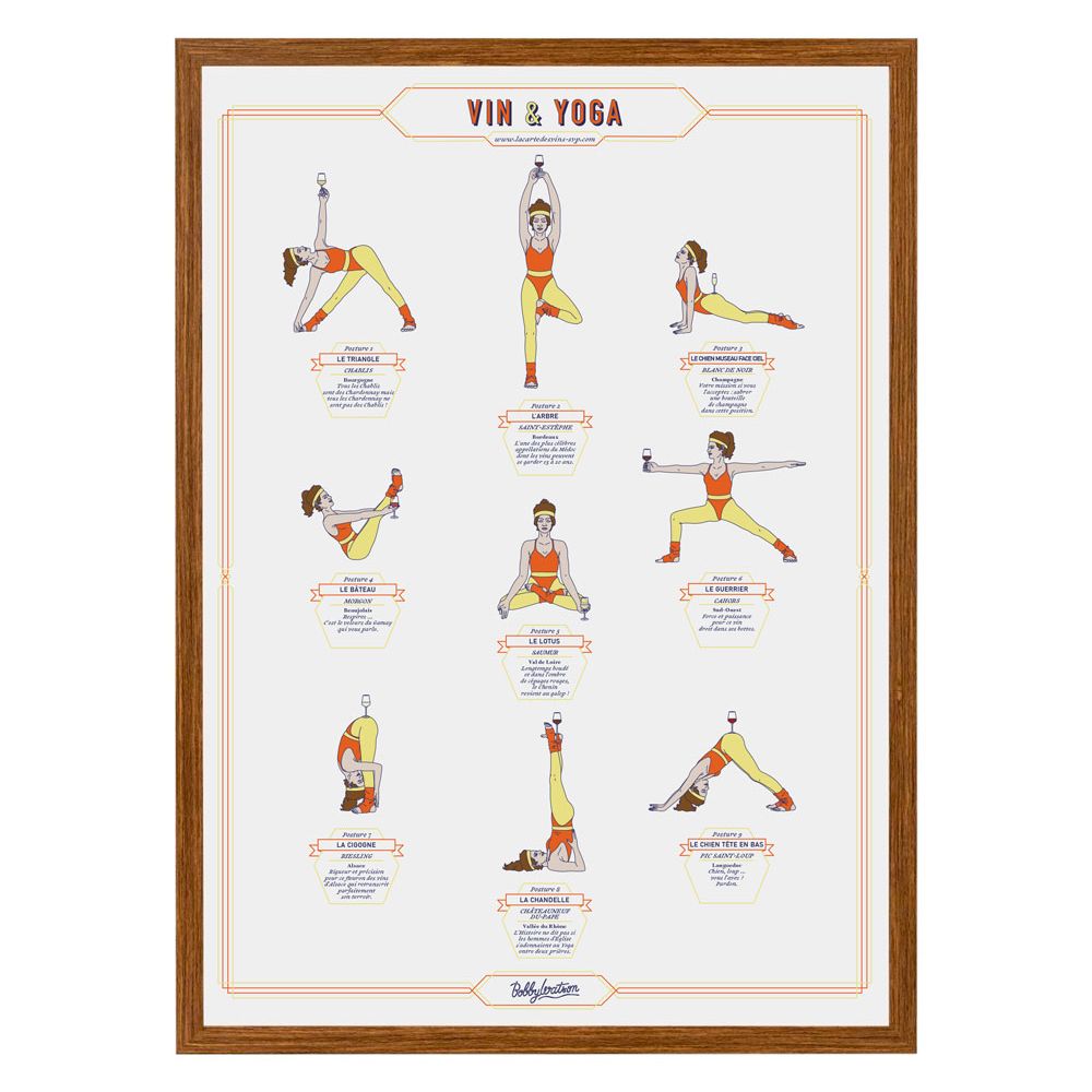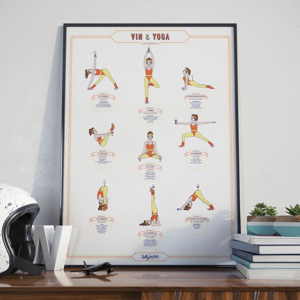 Découvrez l'équilibre parfait entre vin et bien-être avec cette affiche Vin & Yoga (femme). Un design élégant pour décorer votre intérieur et stimuler vos sens avec humour.
