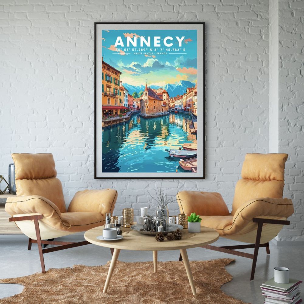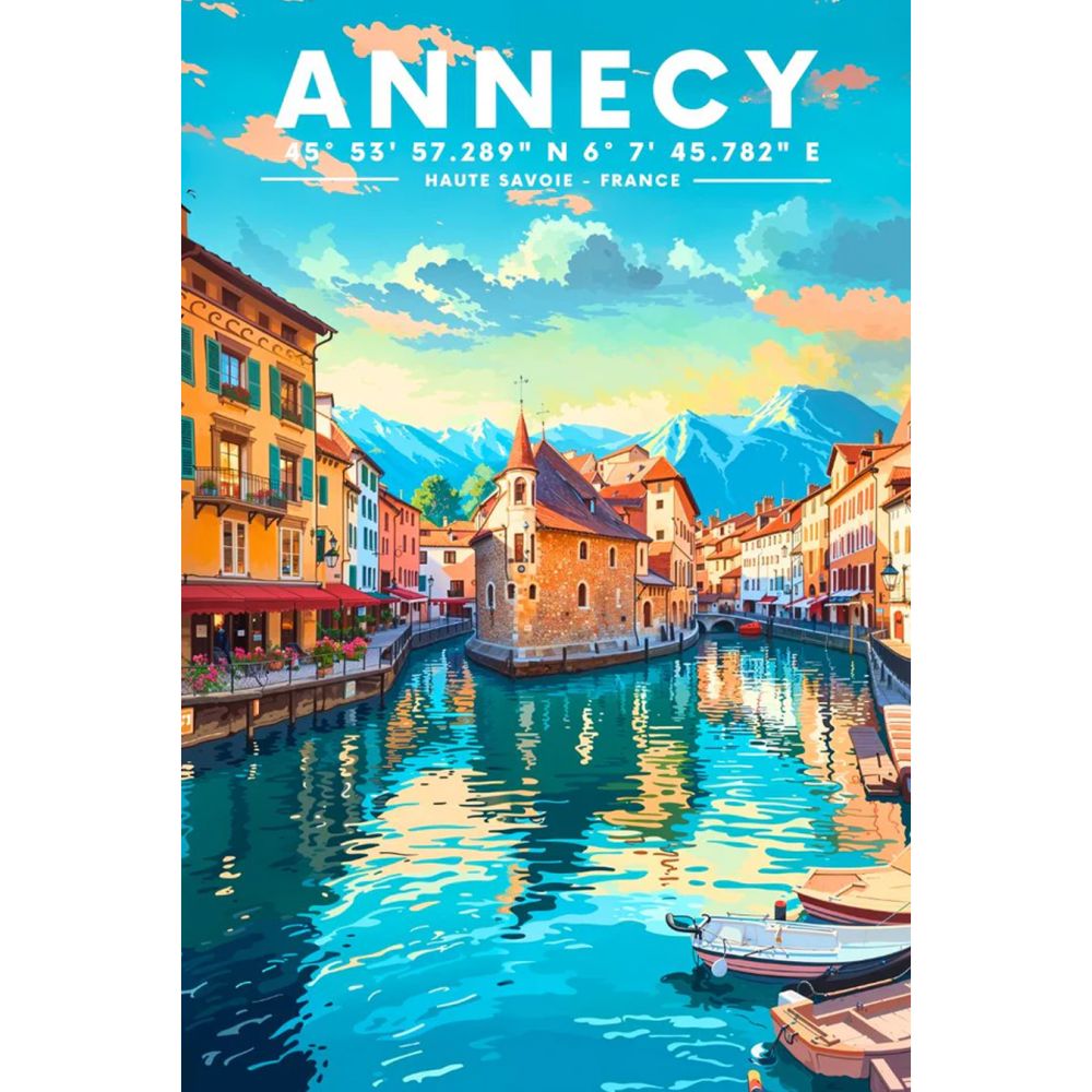 Offrez à votre intérieur une touche d'élégance avec cette affiche rétro inspirée d'Annecy, la magnifique "Venise des Alpes". Représentant un pont pittoresque et des barques glissant paisiblement sur le lac d'Annecy, cette œuvre artistique capture l'atmosphère sereine et intemporelle de la ville, entre ses canaux et ses paysages montagnards.