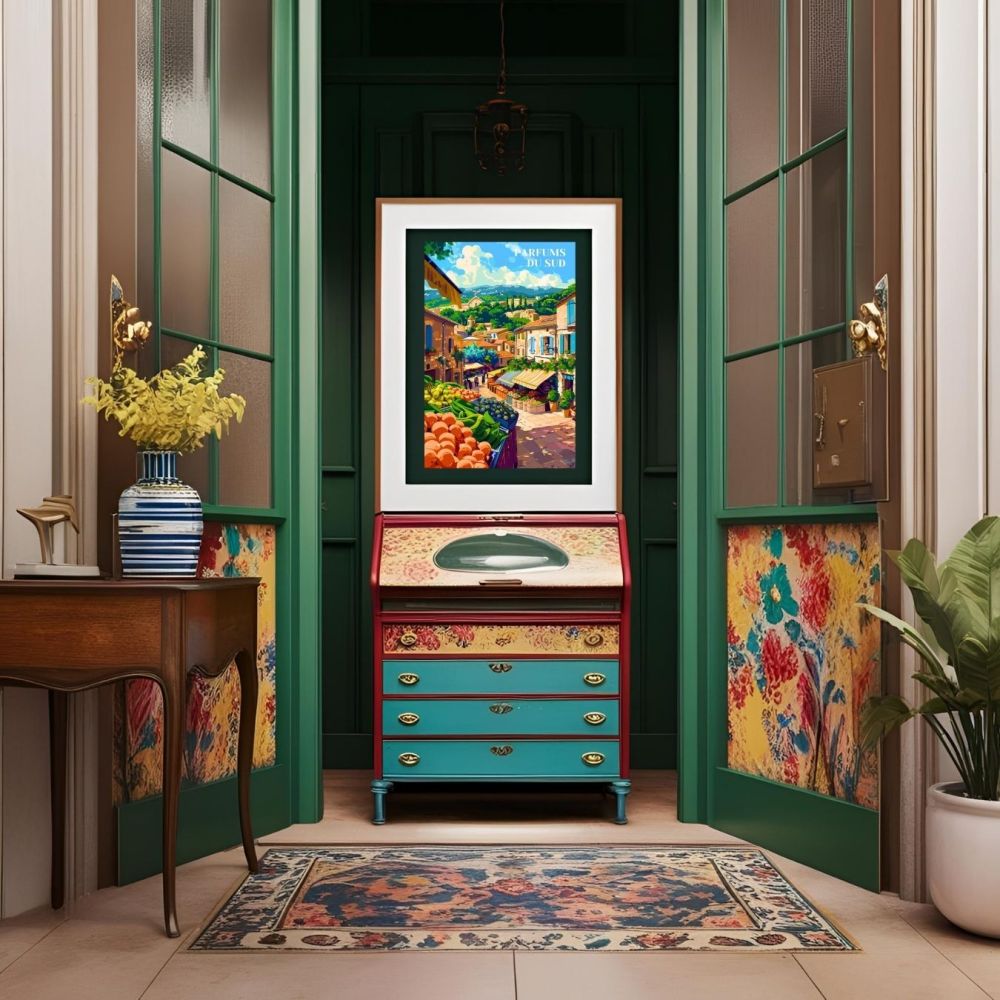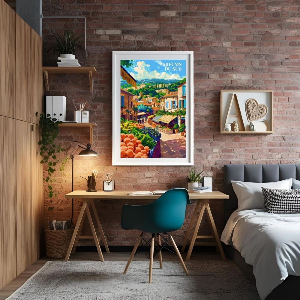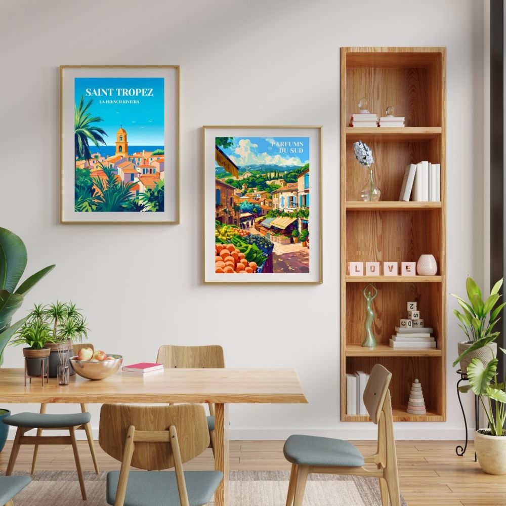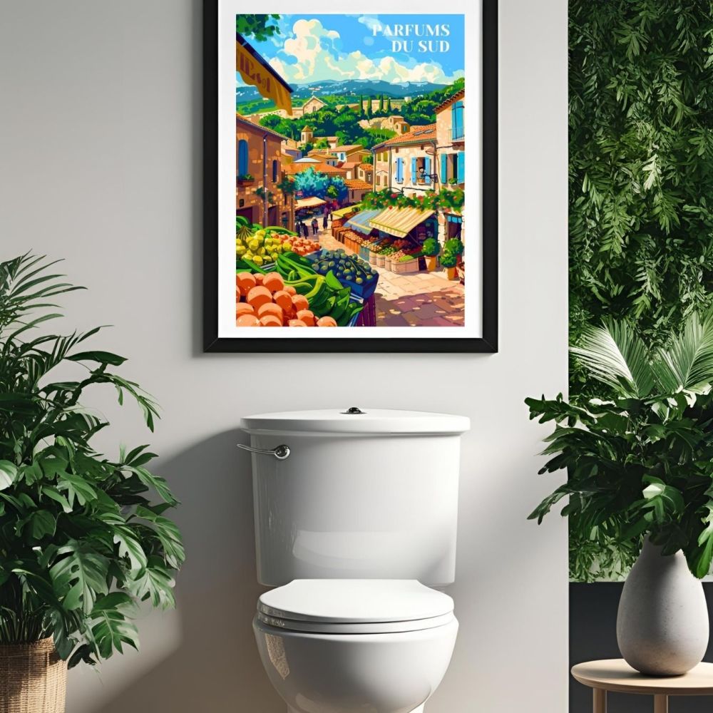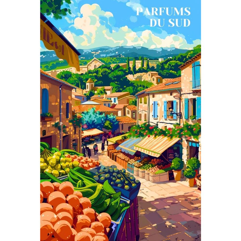 Ce poster est un hommage aux paysages et à la culture méridionale, un véritable atout pour toute décoration intérieure. Que vous souhaitiez ajouter du charme à votre espace ou offrir un cadeau raffiné à un amateur d'art vintage, cette affiche est un choix parfait. Elle apporte non seulement une touche esthétique à votre décoration mais transporte également vos invités dans l'atmosphère parfumée et accueillante des marchés provençaux. Découvrez cette création artistique et laissez-vous emporter par l'ambiance authentique et ensoleillée du sud de la France.