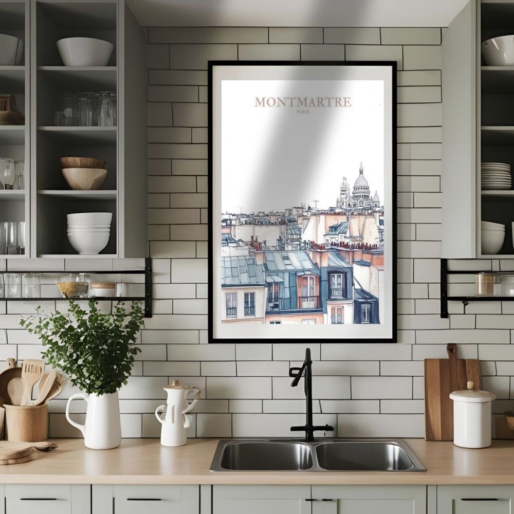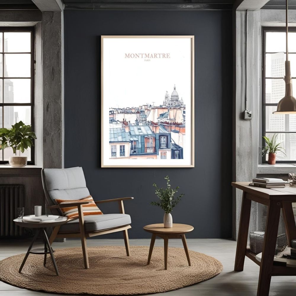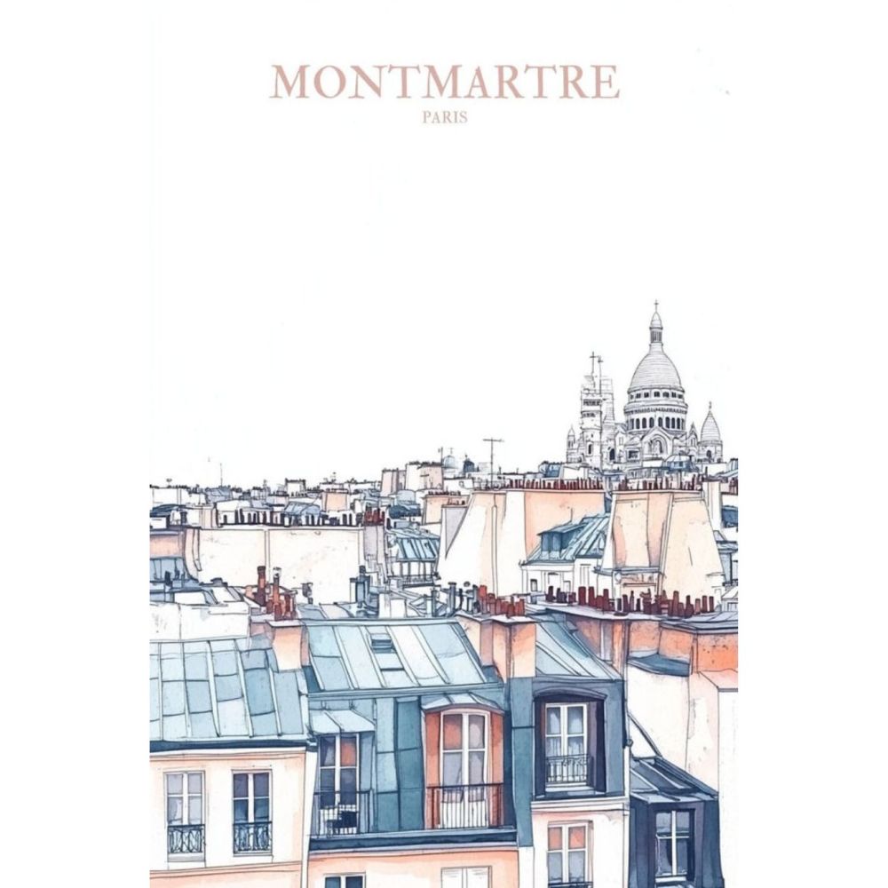 Le style peinture aquarelle et minimaliste de l'illustration, combiné à l'ambiance bohème du quartier, en fait une pièce idéale pour apporter une note de douceur à votre déco murale. Cette affiche capture l'essence même de Montmartre, avec ses toits en zinc et son atmosphère artistique.