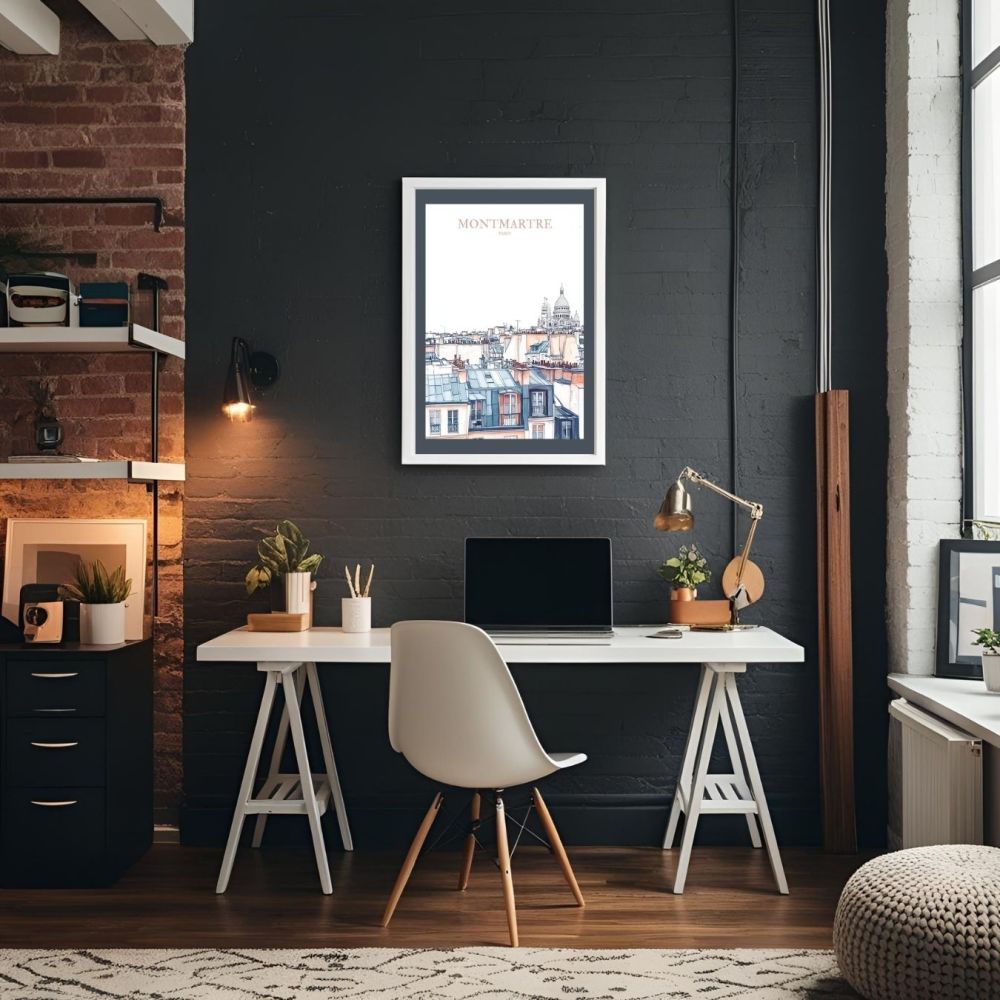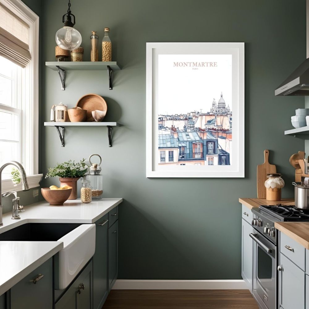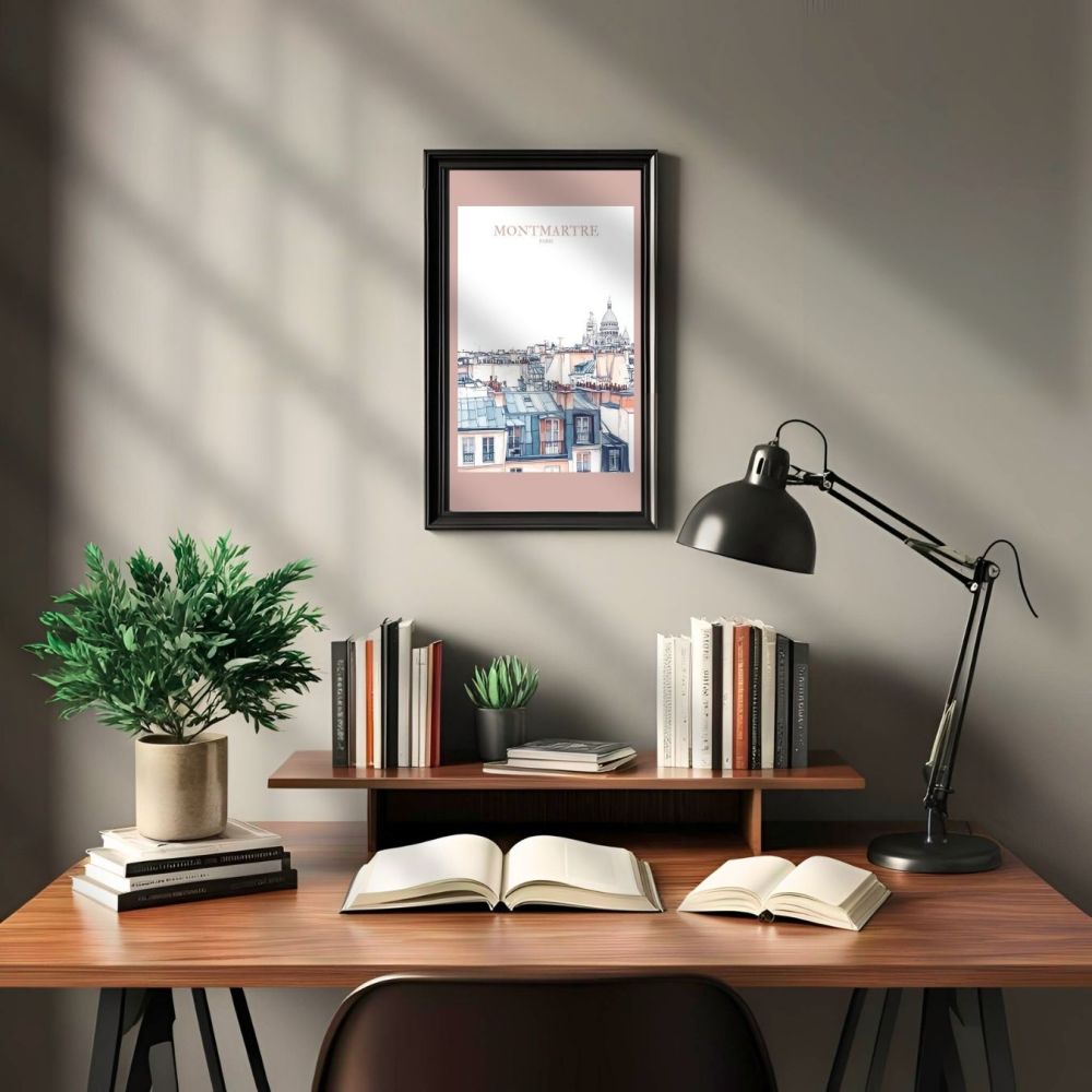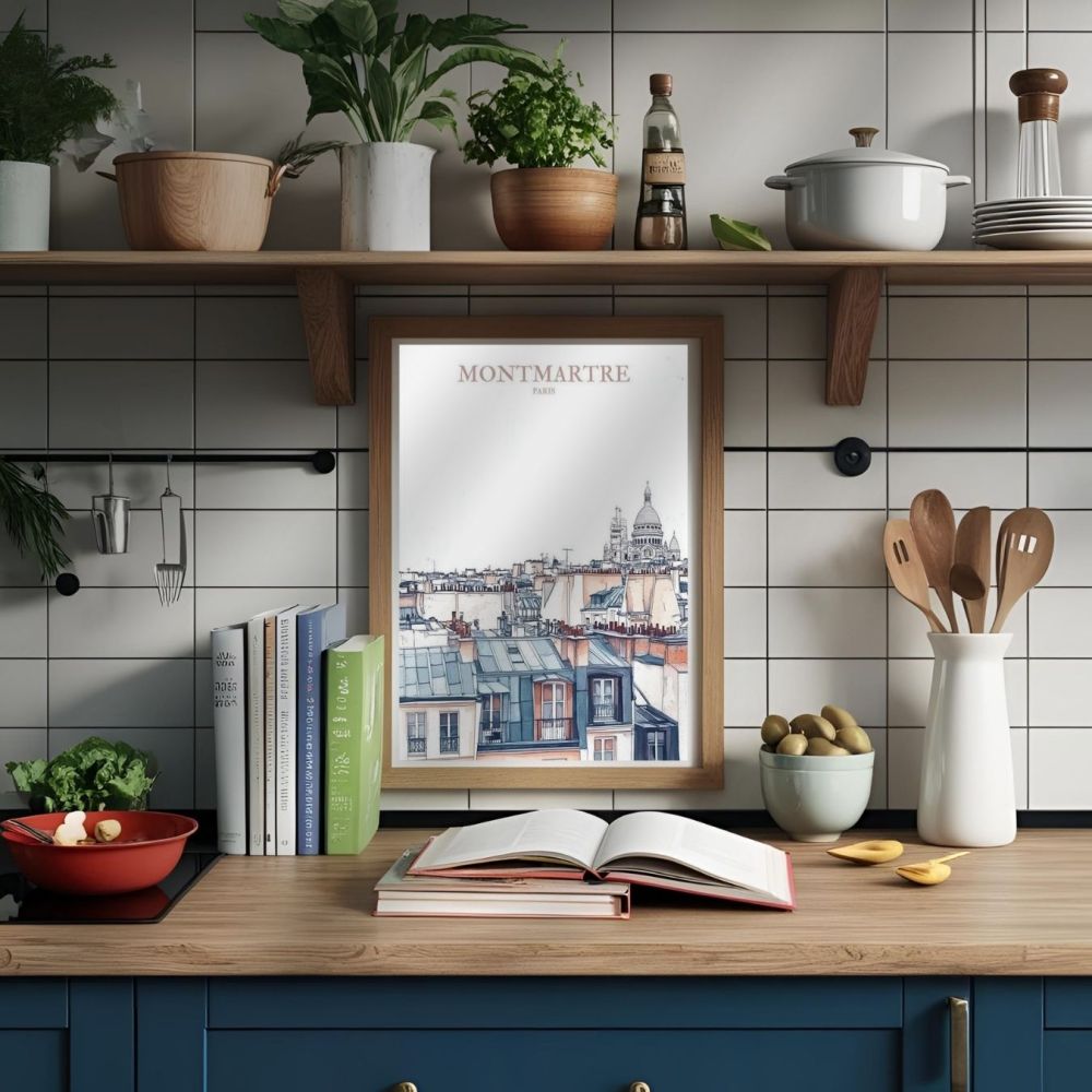 Le style peinture aquarelle et minimaliste de l'illustration, combiné à l'ambiance bohème du quartier, en fait une pièce idéale pour apporter une note de douceur à votre déco murale. Cette affiche capture l'essence même de Montmartre, avec ses toits en zinc et son atmosphère artistique.
