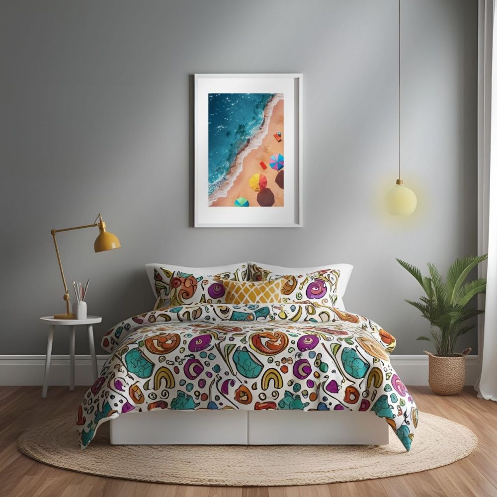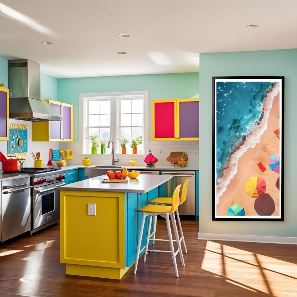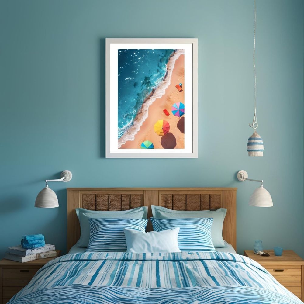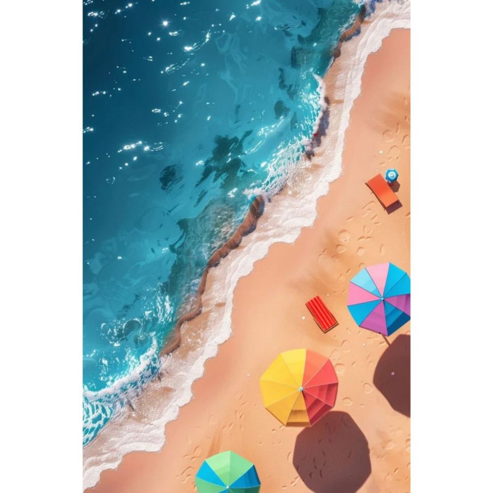 Apportez une touche de sérénité et de charme estival à votre intérieur avec cette affiche Plage, Mer & Parasols, une création esthétique qui capture l'essence de l'été. Ce poster mural, illustrant une scène en hauteur d'une plage ensoleillée, avec parasols et serviettes de plage colorés, évoque la détente et le calme des journées estivales.