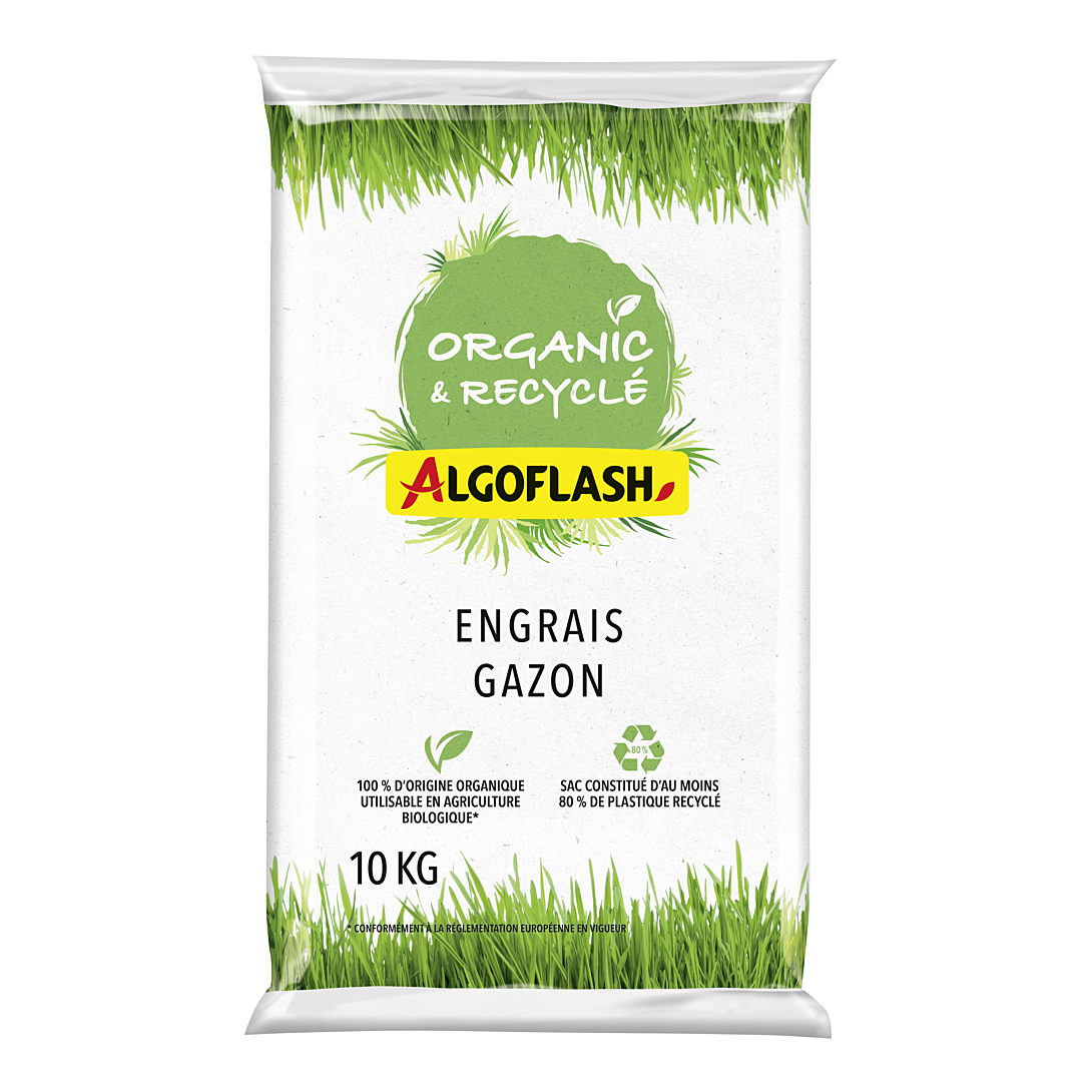 Engrais organique complet adapté au gazon. Fertilise et participe à la bonne croissance du gazon. Emballage composé à 80 % de plastique recyclé. Composé de sous-produits d'industrie dont des résidus de coques de cacao. Label Produit Naturel. Utilisable en Agriculture Biologique*.