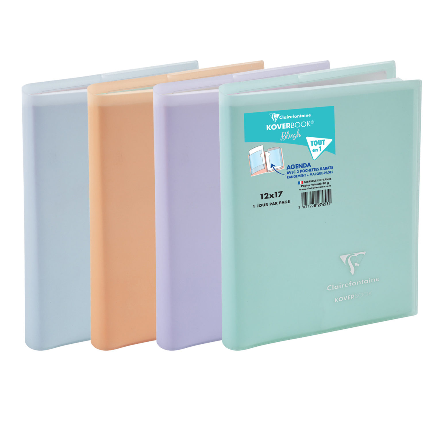 Agenda Scolaire Koverbook Clairefontaine, pratique grâce sa couverture amovible et ses deux rabats avec pochette intégrée *Agenda journalier scolaire avec une présentation 1 jour par page et 2 jours par page pour le week-end. Comprend 43 pages pratiques (emploi du temps, cartes géographique, pages de notes…) *Sa couverture protège-cahier amovible en PVC lui confère solidité et imperméabilité. *Doté de deux grands rabats à pochette, l'agenda Koverbook est parfait pour marquer les jours et ranger mais aussi protéger ses documents. *Couleurs pastels, fraiches et délicates *Papier blanc Clairefontaine pour une écriture douce et fluide *Coins microperforés détachables pour retrouver rapidement la page du jour *Ecologique: papier certifié PEFC pour une gestion raisonnée des forêts *4 couleurs assorties