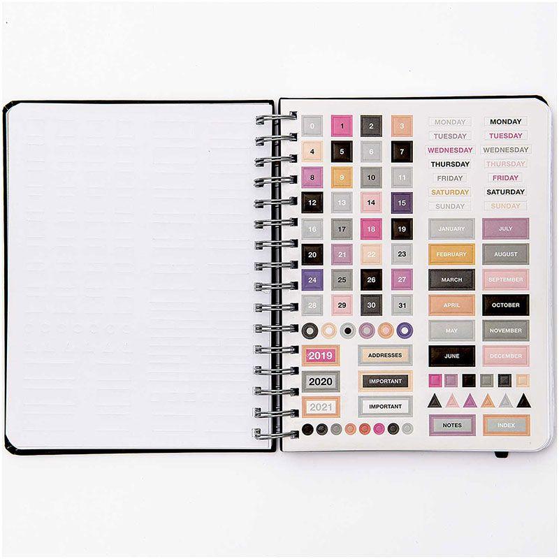Agenda spécial Bullet journal à spirales 96 feuilles - 16,5 x 21,5 cm Avec l'agenda spécial bullet journal de la marque Rico Design, organiser votre quotidien n'a jamais été aussi facile et amusant ! Ce carnet de 16 cm x 21 cm est composé de 192 pages numérotées et pointillées à customiser. Il contient également 2 feuilles d'autocollants et un aperçu annuel 2019/20/21. La couverture est rigide et pelliculée mat, elle est de couleur noire avec une reliure en spirale et un élastique noir fait office de fermeture. Dimensions : 21 x 16 cm.
