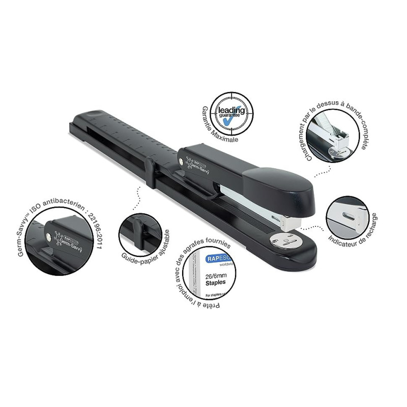 | Libellé | Agrafeuse - Long bras - Agrafes 26/6mm - Noir - Inclus 5000 agrafes - Rapesco |