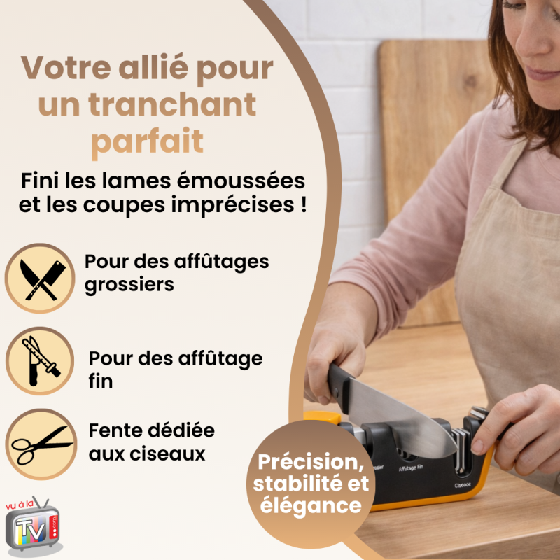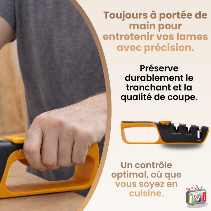 - Affûtage efficace et maîtrisé : l'aiguiseur couteaux manuel permet de restaurer rapidement le tranchant des lames grâce à un système d'affûtage progressif, adapté à l'entretien régulier des couteaux de cuisine sans effort.