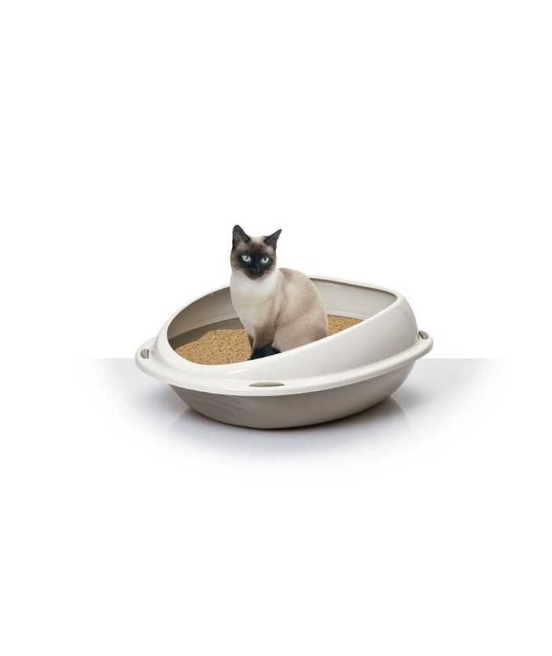 Bac a litiere ovale taupe et beige - Il possede une hauteur d'entrée basse pour faciliter l'acces de votre chat - Le Bac a litiere pour chat Shuttle de Aime est équipé d'un rebord de protection amovible, qui assure une propreté optimale de la piece, en évitant les projections d'urines ou de litiere - 57 x 40 x 19 cm.
