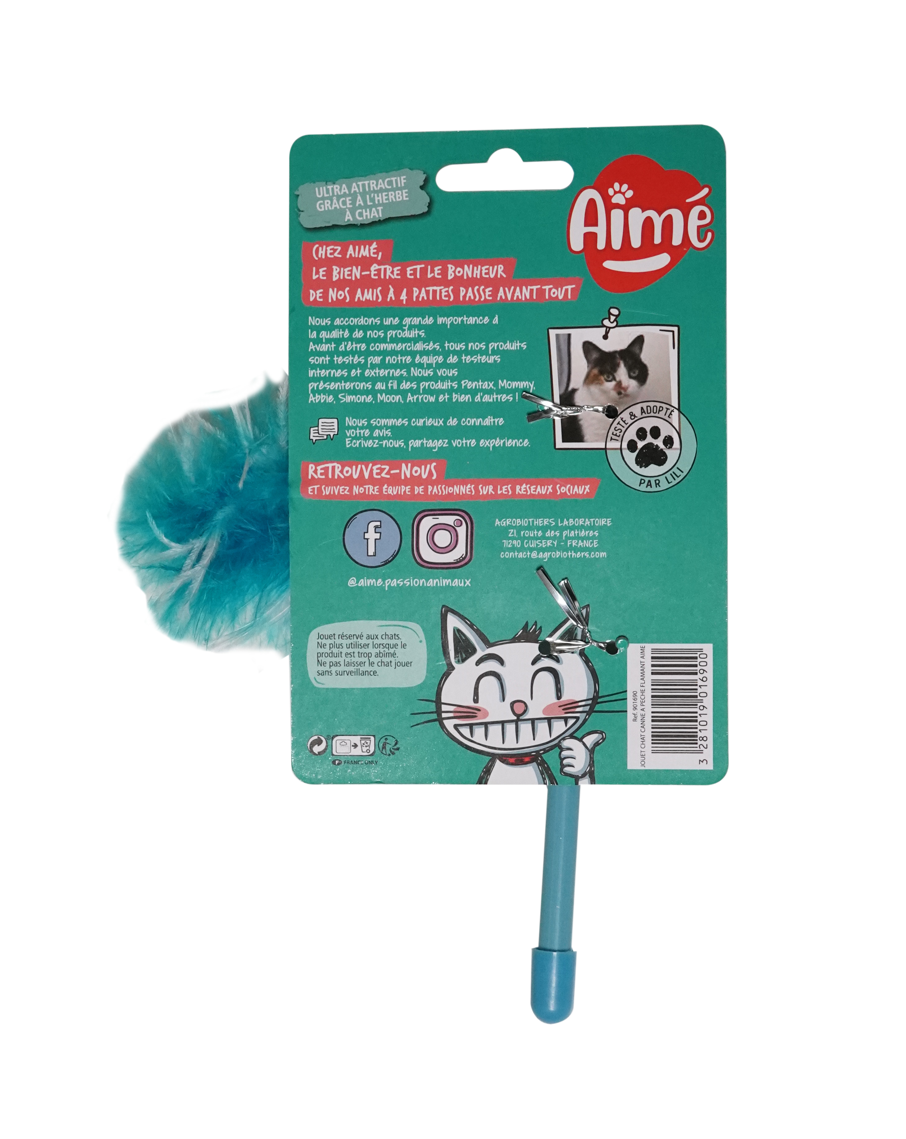 Une Canne à pêche pleine de plumes bleues et blanches, rigolote en forme de flamant rose Le manche est en plastique. La peluche contient un grelot et du catnip.