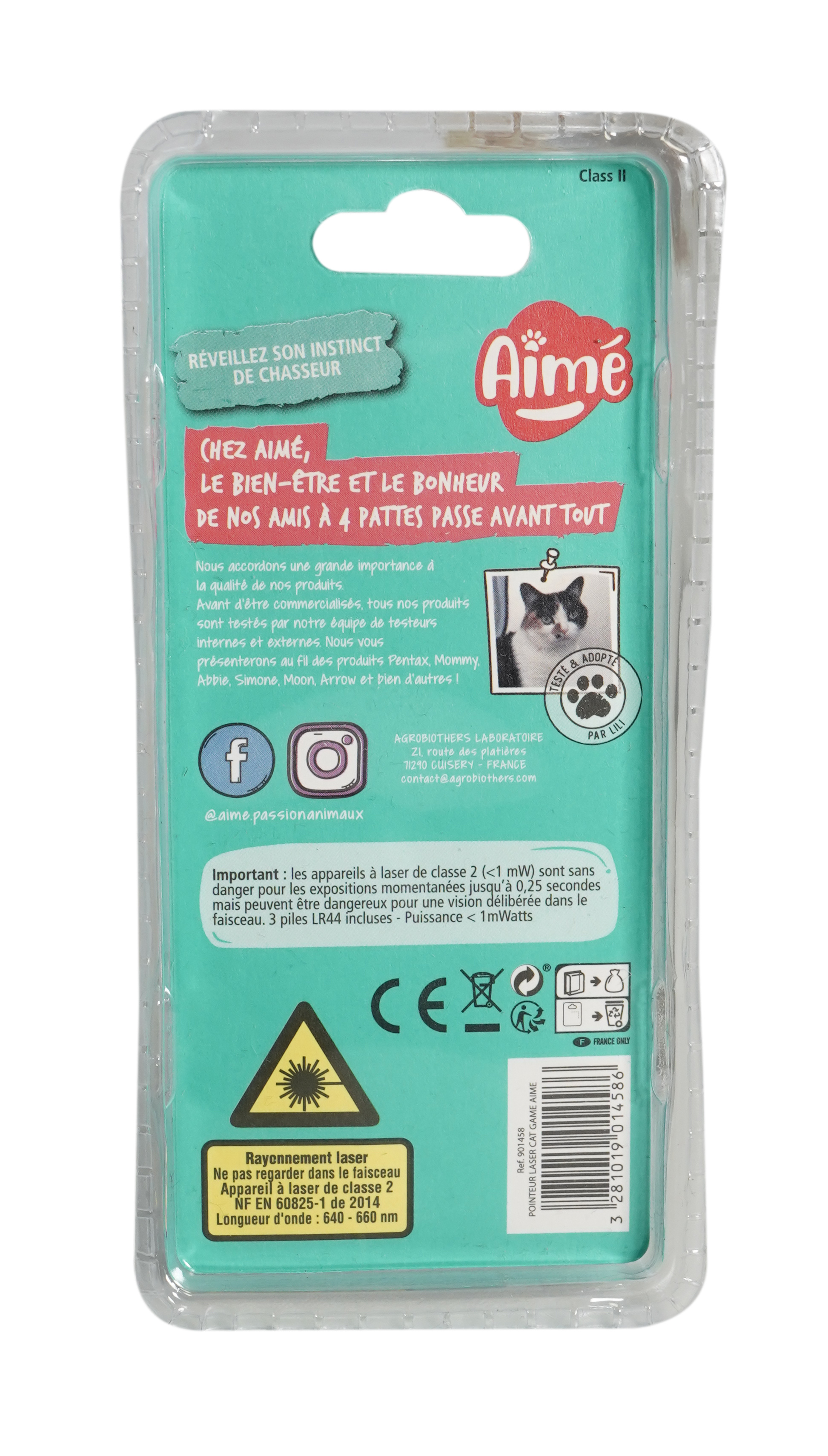 Ce pointeur laser pour chat, est parfait pour ces moments de jeux. Avec un vaisseau rouge, il aimera et sera enthousiasme de pouvoir courir après cette lumière, sauter et la suivre n'importe où. Vous pourrez jouer ensemble, et vous prendrez du plaisir à le voir se défouler après cette lumière. Inoffensive pour votre chat, il sera concentré sur ce jeux, et content de pouvoir chasser à l'extérieur et à l'intérieur avec ce laser. Ce jeux est parfait, pour passer un bon moment avec votre chat. Ce laser émet une lumière que poursuivra et traquera votre chat. 3piles LR44 incluses. Puissance < 1mWatts TAILLE DE L'ANIMAL : toutes tailles