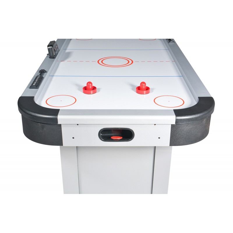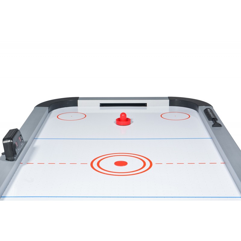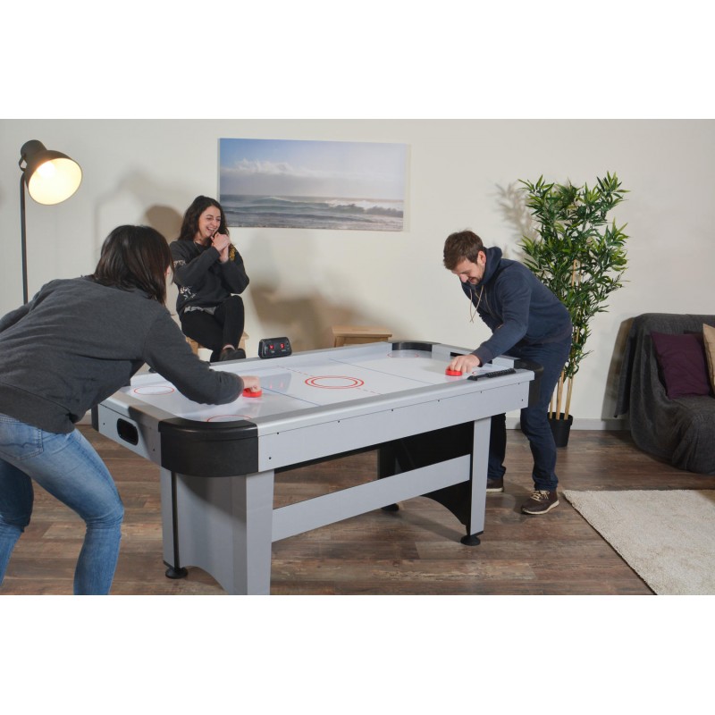 Cette table de jeux possède des buts électroniques et un moteur électrique très puissant projetant de l'air à haute pression par les orifices de la table. Moment de convivialité garanti !