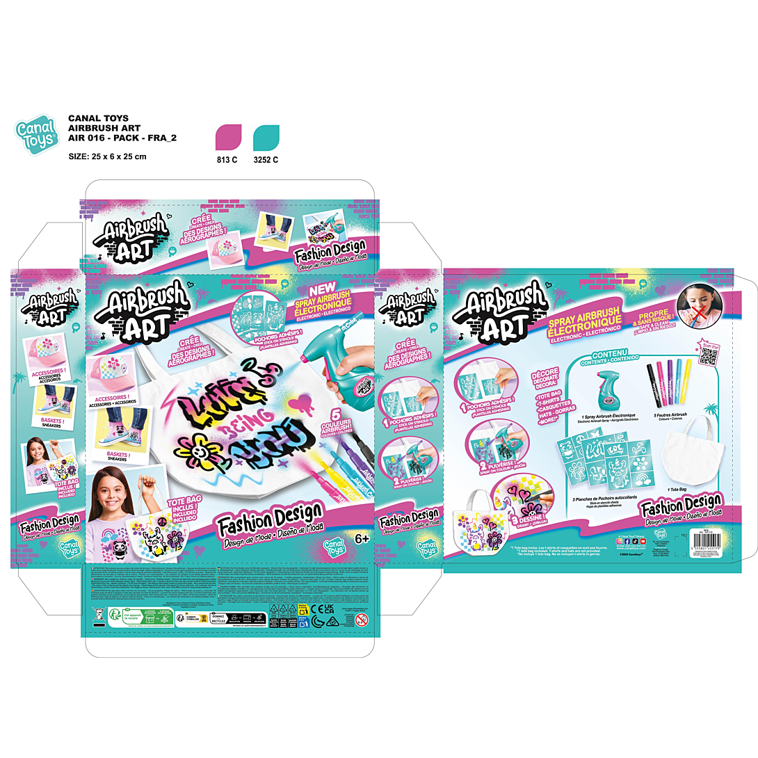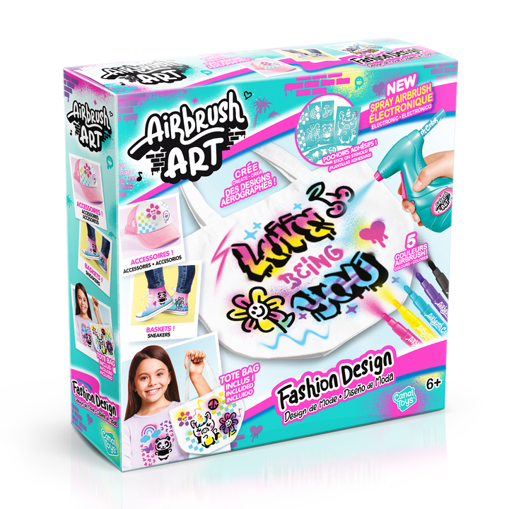 Décore tes vêtements et accessoires en textile avec ce kit aérographe Airbrush Art ! Insère un feutre dans le spray électronique et pulvérise sur le tote bag inclus. Des feutres et des pochoirs sont fournis pour créer des effets graphiques uniques !