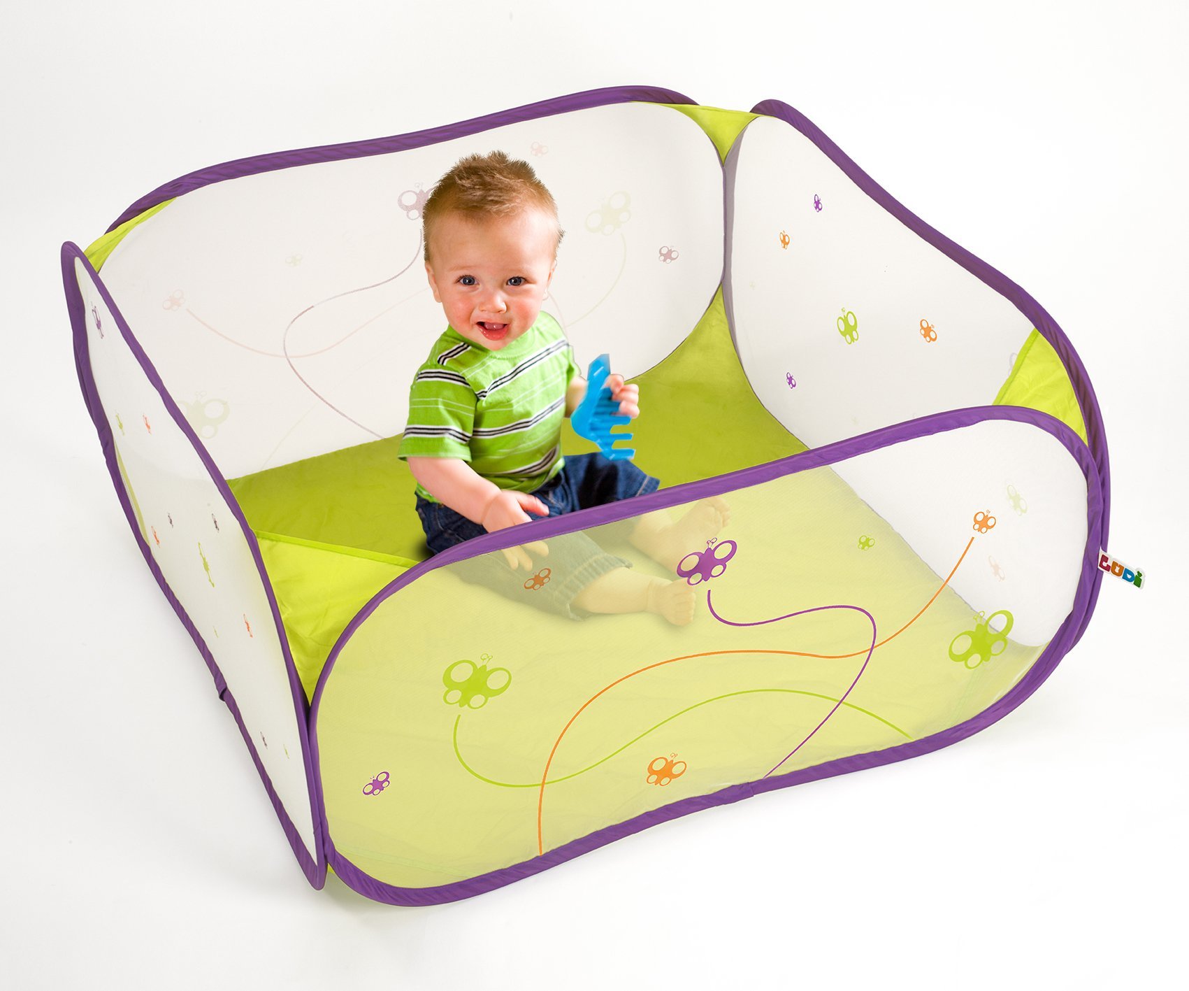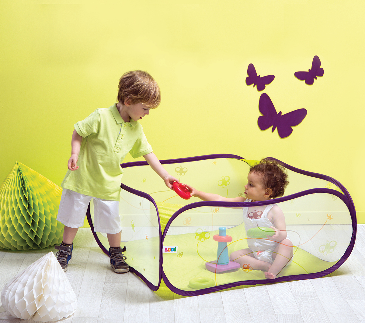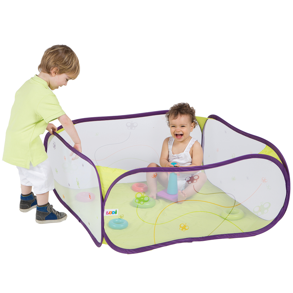 Prêt en deux temps et un mouvement ! L’aire d’éveil pop-up au joli thème des papillons, délimite un espace de jeu pour bébé qui pourra jouer avec ses jouets préférés. Nomade, cette aire de jeu peut se transporter partout. Sa structure pop-up légère et souple est très facile à installer ou à replier. En un clin d’œil, vous pourrez aisément la ranger dans son sac de transport pour profiter des vacances ou des week-ends en famille avec bébé. À la maison, vous pourrez la laisser pliée et la glisser derrière un meuble ou l’utiliser comme coffre à jouets ! Pour plus de praticité, sa taille moyenne permet d’éviter les encombrements à la maison, mais l’aire peut facilement accueillir deux enfants pour encore plus de fous rires ! L’aire d’éveil pop-up n’est pas un parc dû à sa légèreté et sa souplesse, mais utilisée dans l’enceinte rigide du parc, elle peut protéger bébé des barreaux. Appliquée en espace de jeu indépendant, la structure flexible permettra aux « plus grands » d’entrer et de ressortir facilement. Pour les tout-petits capables de se déplacer à quatre pattes, nous recommandons une surveillance des parents car les parois souples ne pourront les retenir. Adaptée dès la naissance. Dimensions : 90 x 90 x 44 cm. Nettoyage simple avec un chiffon humide.