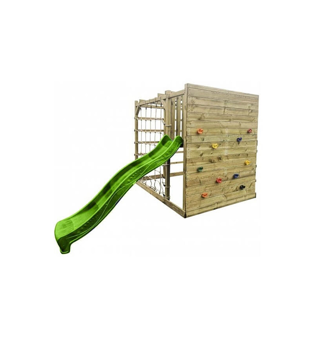 L'aire de jeux multi escalade possède un mur d'escalade avec 10 prises, un superbe toboggan double vague, des barres d'escalade en bois et une échelle cordée horizontale. Un modèle idéal pour les enfants âgés de 5 à 12 ans qui aiment grimper !