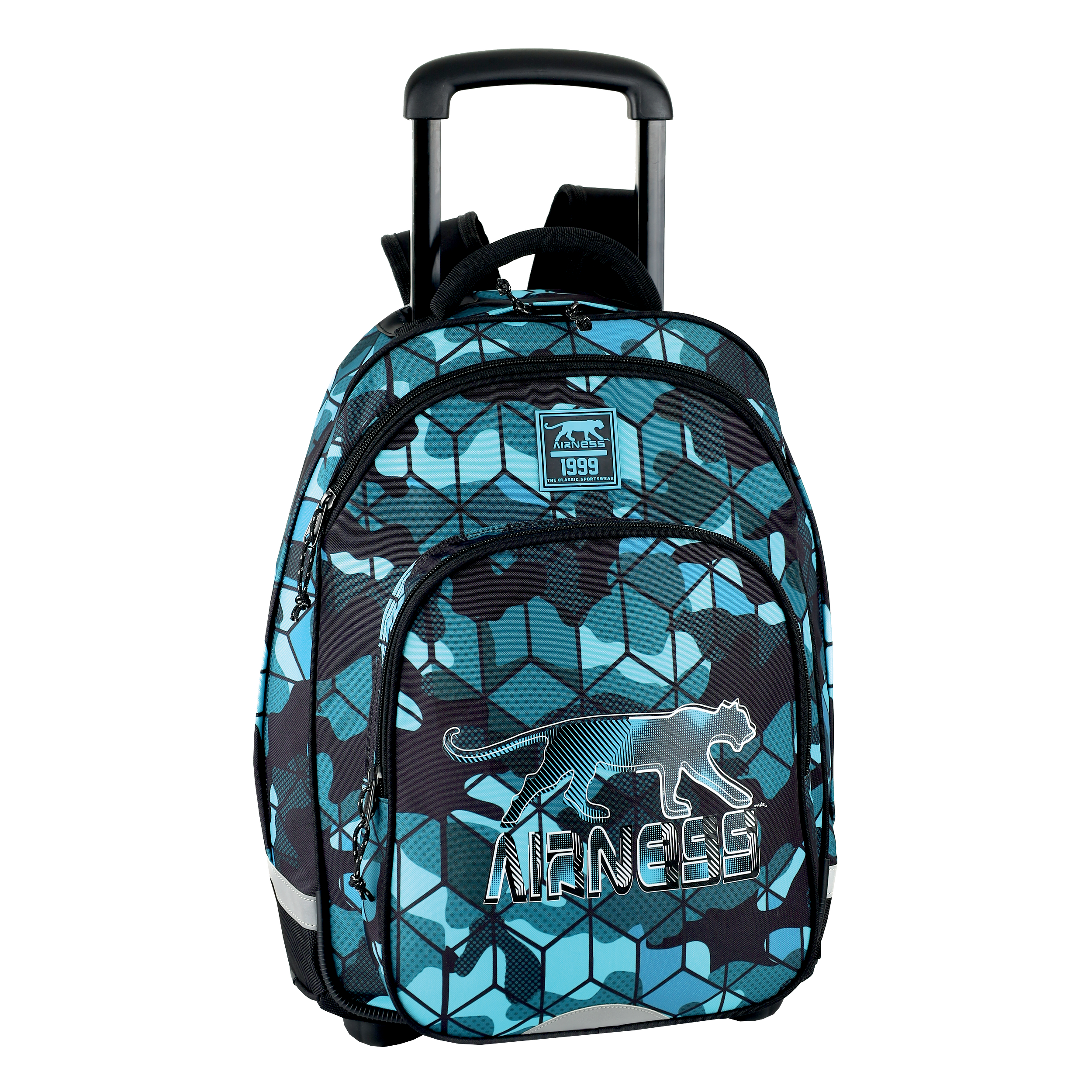 Passer le carrousel d'imagesLe sac scolaire à roulettes Airness Donato arbore un design indémodable pour accompagner les élèves à l’école avec style et confort. Ses coloris bleu tendance et sa silhouette de panthère en font un accessoire original ! Son grand format et ses roulettes, sont idéals pour les classes à partir de la primaire. Fabriqué en matière polyester, sa texture est souple et très résistante. Les 2 compartiments du sac à roulettes Airness sont compatibles avec les formats A4 et 24 x 32 cm. Pour faciliter le rangement de l'ensemble du matériel scolaire, les grands compartiments permettent d’y accueillir et de ranger soigneusement : Cahiers, classeurs à anneaux, chemise, agenda/cahier de texte, trousse... Les roulettes permettent à son petit propriétaire d'emporter tout son nécessaire pour la journée d'école. Petites fournitures, en-cas pour la pause peuvent être glissés dans la poche extérieure zippée, pour être retrouvés en un rien de temps ! La poche intérieure permet d’y ranger de petits effets personnels ou encore le trousseau de clés de la maison … Petits plus : le sac à roulettes dispose d'un porte étiquette pour éviter de le confondre avec celui d’un camarade ainsi que d’un porte emploi du temps afin de garder une bonne organisation tout au long de l’année. Pour une parfaite visibilité sur le chemin de l’école, le sac à roulettes Airness est équipé de bandes réfléchissantes sur les bretelles et à l’avant. Il se transporte de manière agréable en le saisissant par sa poignée télescopique à double canne et en le faisant glisser sur ses 2 roues gommes silencieuses. Pour une bonne stabilité, des renforts rigides sont présents sur le dessous du sac à roulettes. Astucieux : une cape de protection permet soit de ranger les bretelles pour ne pas les abimer ou de protéger les roues pour éviter de salir les vêtements de son propriétaire ! Il est également possible de le porter avec ergonomie sur les épaules à l'aide de ses bretelles matelassées et ajustables. Sa poignée de portage permet également de le porter confortablement à la main.En cas de pluie, son contenu est gardé bien au sec grâce à sa doublure en tissu et à son fond renforcé pour une meilleure étanchéité. Le fond est solidifié pour absorber les éventuels chocs qu'il pourrait subir dans la cour de récré.