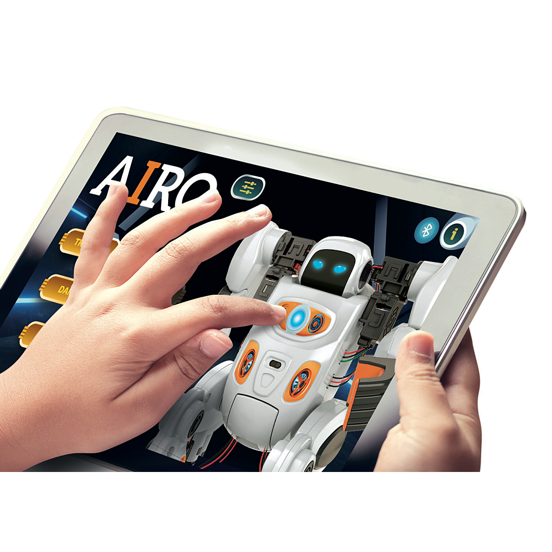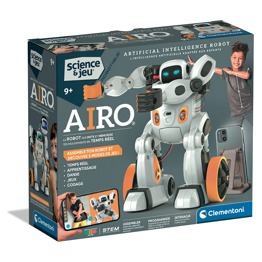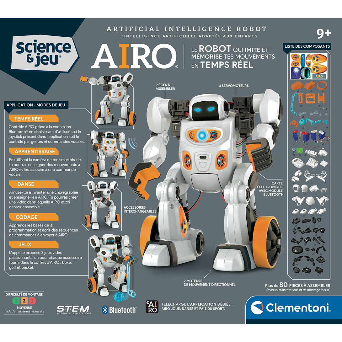 • Un robot innovant à assembler, doté d'une intelligence artificielle qui lui permet de reconnaître les gestes et les commandes vocales. • Personnalise ton robot en l'entraînant à reconnaître tous les gestes que tu souhaites et amuse-toi avec lui à travers de nombreuses activités amusantes. • 6 moteurs lui permettent d'effectuer tout type de mouvement : se déplacer dans toutes les directions ou encore lever les bras. • Dans le mode "Apprentissage", place-toi face à la caméra de ton smartphone, réalise un mouvement avec ses bras que le robot apprendra et répètera à son tour. Le mouvement sera mémorisé et pourra être associé à une commande vocale. • Dans le mode "Jeu", programme ton robot ou utilise les commandes vocales et les gestes en temps réel après les avoir enseignées au robot. Tu pourras ainsi faire faire toutes sortes d’activités à ton robot : attraper, pousser, danser, faire du sport...