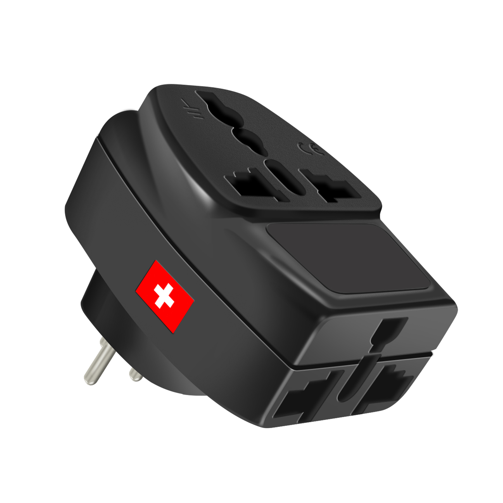 Adaptateur de voyage compact pour Suisse avec prise Type J et 3 prises universelles. Idéal pour les voyageurs, léger et pratique. Résistant et sécurisé pour tous vos appareils électroniques.