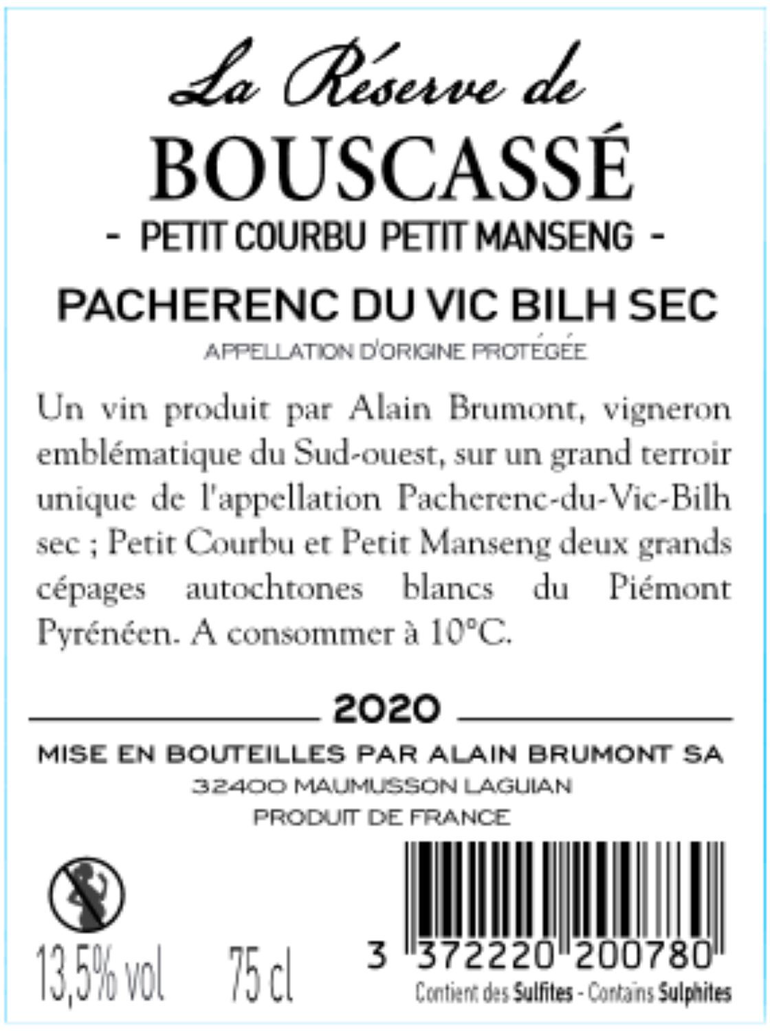 | Libellé | Alain Brumont La Réserve de Bouscassé , 2020 - Pacherenc du Vic-Bilh AOP - Blanc Moelleux - 75 cl |