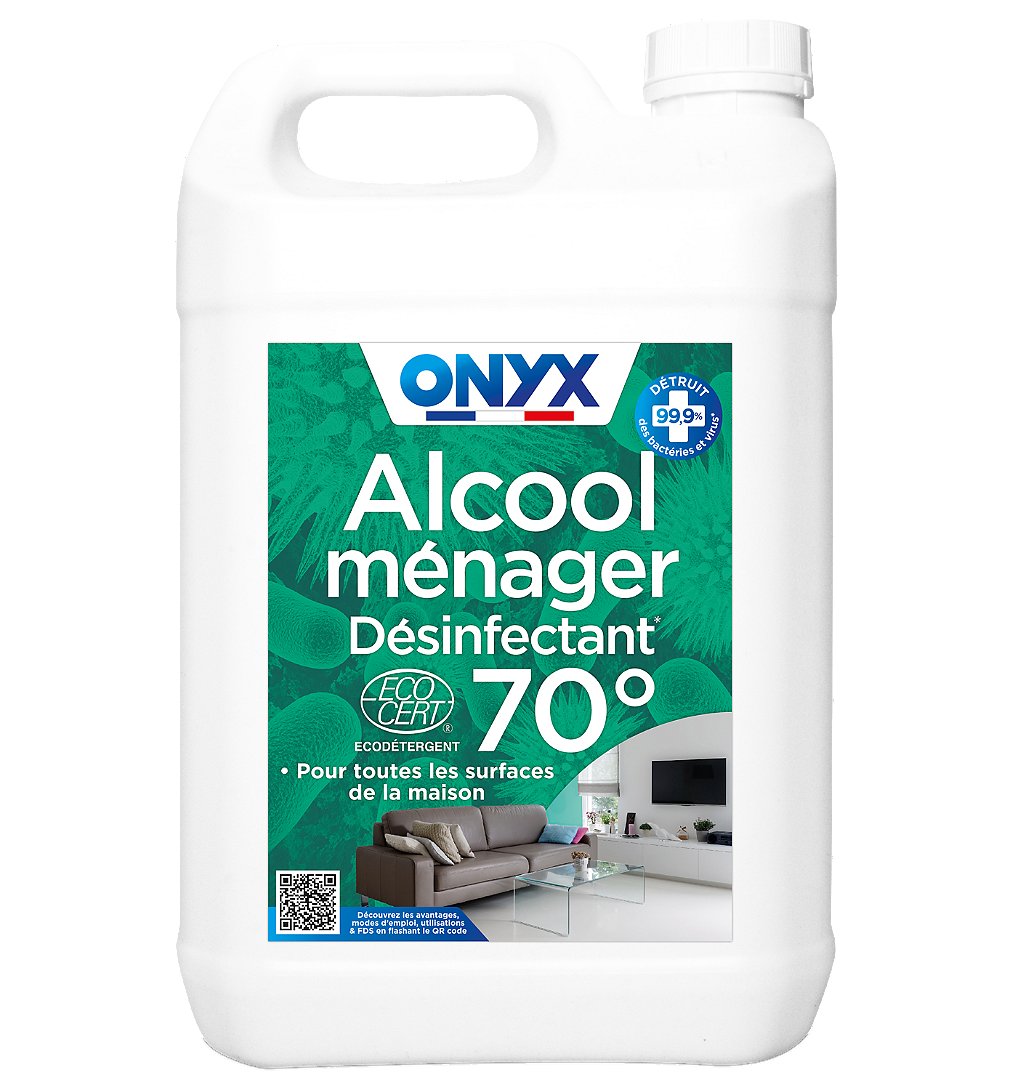 L'Alcool ménager 70° Onyx est pensé pour nettoyer, dégraisser et désinfecter* les différentes pièces de la maison. Il permet d’éliminer* 99.9% des virus et des bactéries