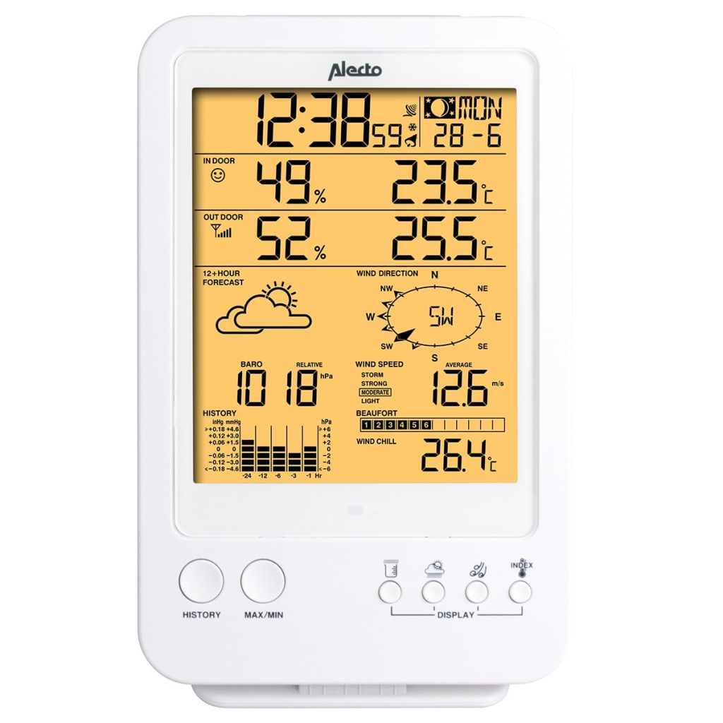 Cet appareil peut également servir de réveil avec affichage de l'heure et de la date. Il affiche simultanément les valeurs de mesure suivantes : affichage de l'heure, de la date, de la phase de lune, des prévisions météo animée, de l'indication de confort, de la pression barométrique ou des précipitations, de la direction du vent, de la vitesse du vent, de l'humidité intérieure et extérieure, de la température intérieure et extérieure et du refroidissement éolien. L'unité d'affichage peut être placée sur une table ou fixée au mur. Sans fil et numérique, elle est facile à installer (sans câbles) et à lire.