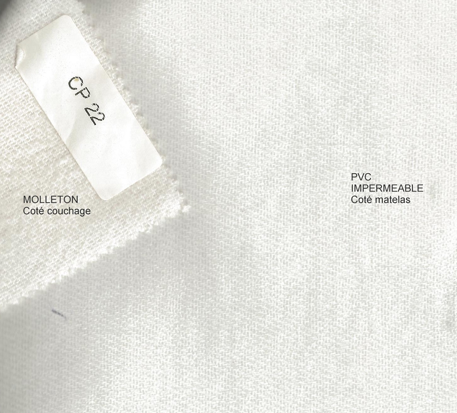 - Avec un film PVC coté matelas et molleton 220 gr/m2, confort doux sur face couchage.
