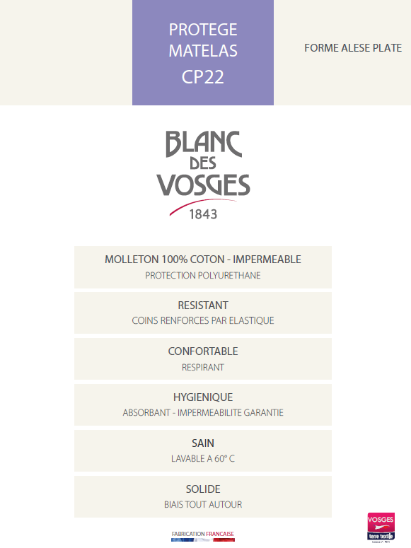 | Libellé | Alèse Plateau Imperméable Blanc des Vosges 140x190 |