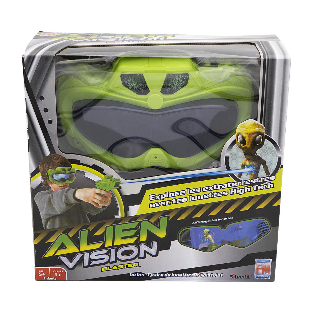 ALIEN VISION. Munis-toi de ton pistolet et chasse les aliens qui apparaissent dans le masque 3D Alien Vision ! 90 secondes pour marquer le plus de points possible ! Chasse le plus d’aliens possible et remporte la partie. Possibilité de jouer seul(e) ou à plusieurs (à tour de rôle). Inclus 1 masque 3D et 1 pistolet ! 4 niveaux de difficulté disponibles (facile, moyen, difficile, survivant). Fonctionne avec 6 piles "AAA" non incluses. À partir de 5 ans.