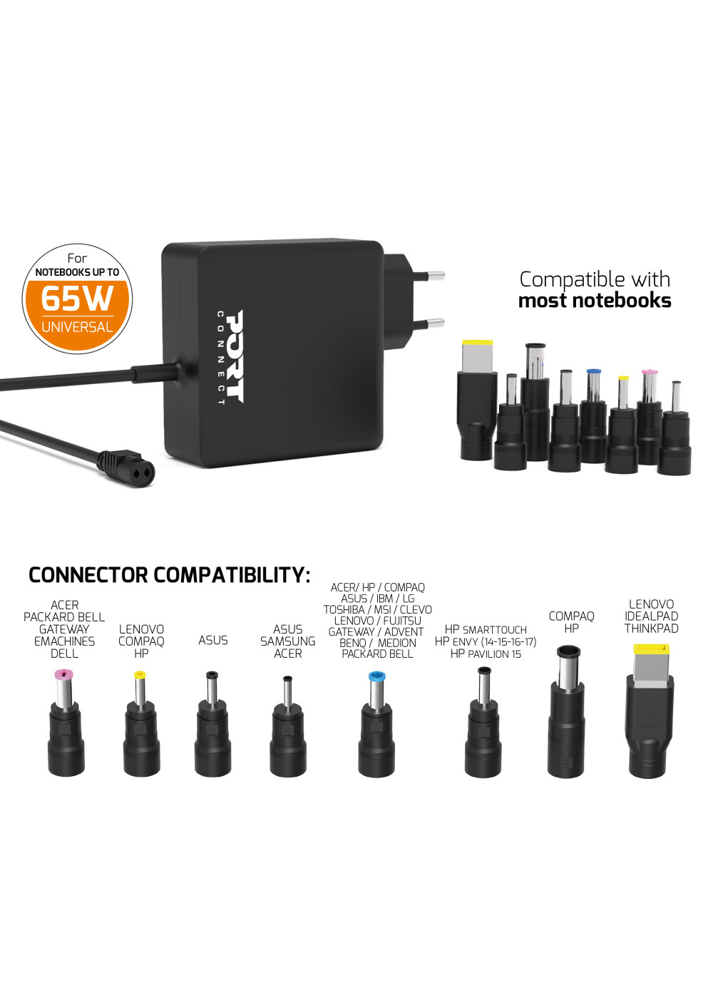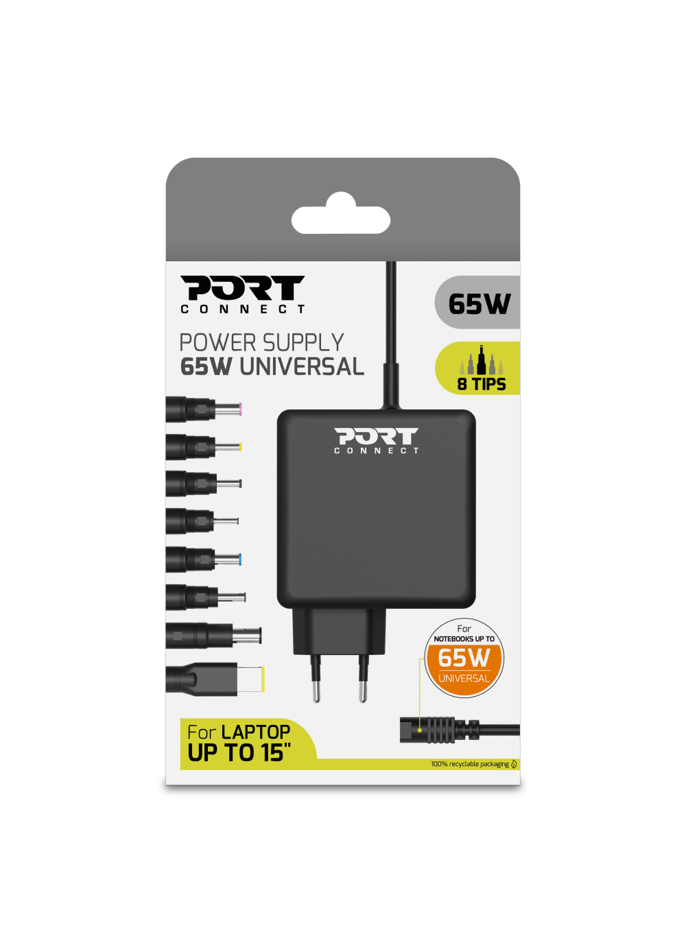 Alimentation secteur de remplacement pour notebook jusqu’à 65W • Compatible avec la plupart des Notebooks jusqu’à 15’’ • 8 embouts universels compatibles avec : Lenovo, Dell, Packard Bell, eMachines, Gateway, Acer, Samsung, HP, Compaq, Asus, Toshiba, LG, Fujitsu, MSI, Benq, Medion, Clevo, IBM, IDEALPAD, THINKPAD, Advent • Adaptable à la puissance de votre machine & protection contre les survoltages • 65 W maximum